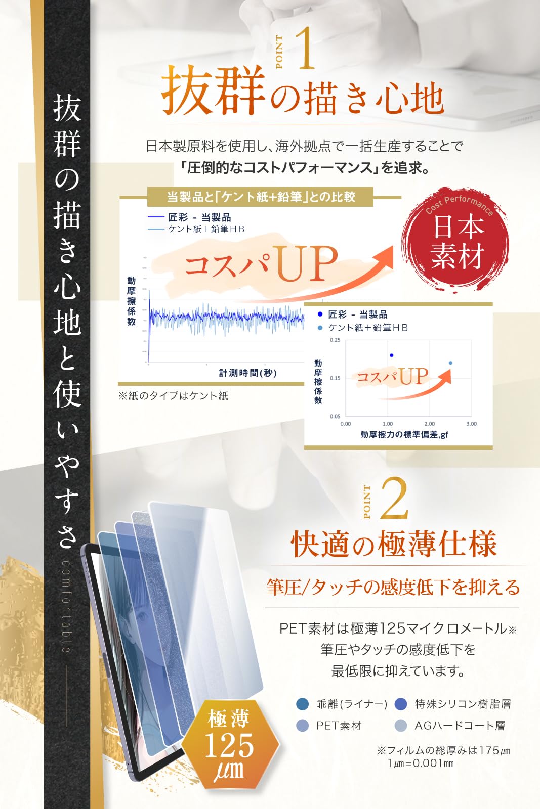 * 【快適の 極薄仕様 】 フィルム のPET部は厚み 0.125 マイクロメートルの極薄仕様。 筆圧 や タッチ の 感度低下 を 最低限 に抑えています。