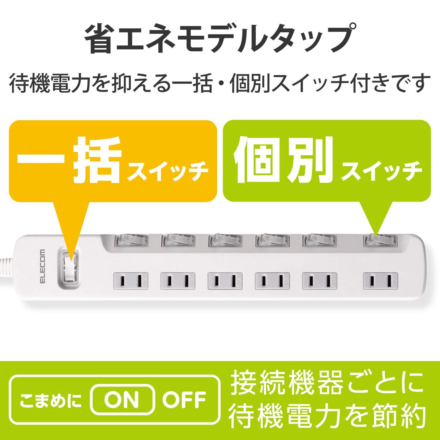 エレコム 電源タップ 一括&個別スイッチ 省エネ スイングプラグ 6個口 2m ホワイト T-E7A-2620WH
