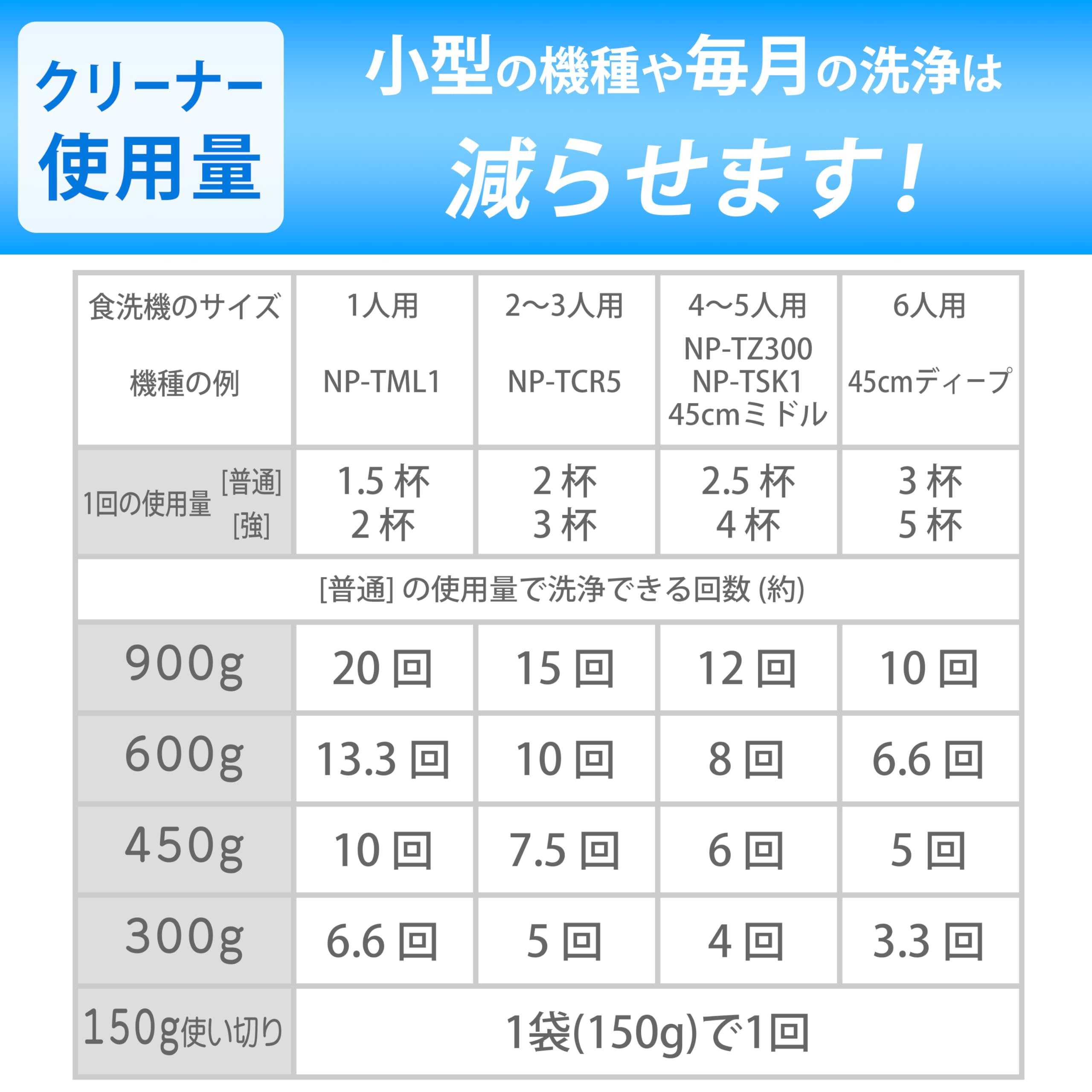 * 日本製。成分:有機酸95% ビタミンC、液性:酸性。卓上、ビルトイン食洗機に対応し、取扱説明書でパナソニック N-P300 等の案内がある機種にも使用できます。