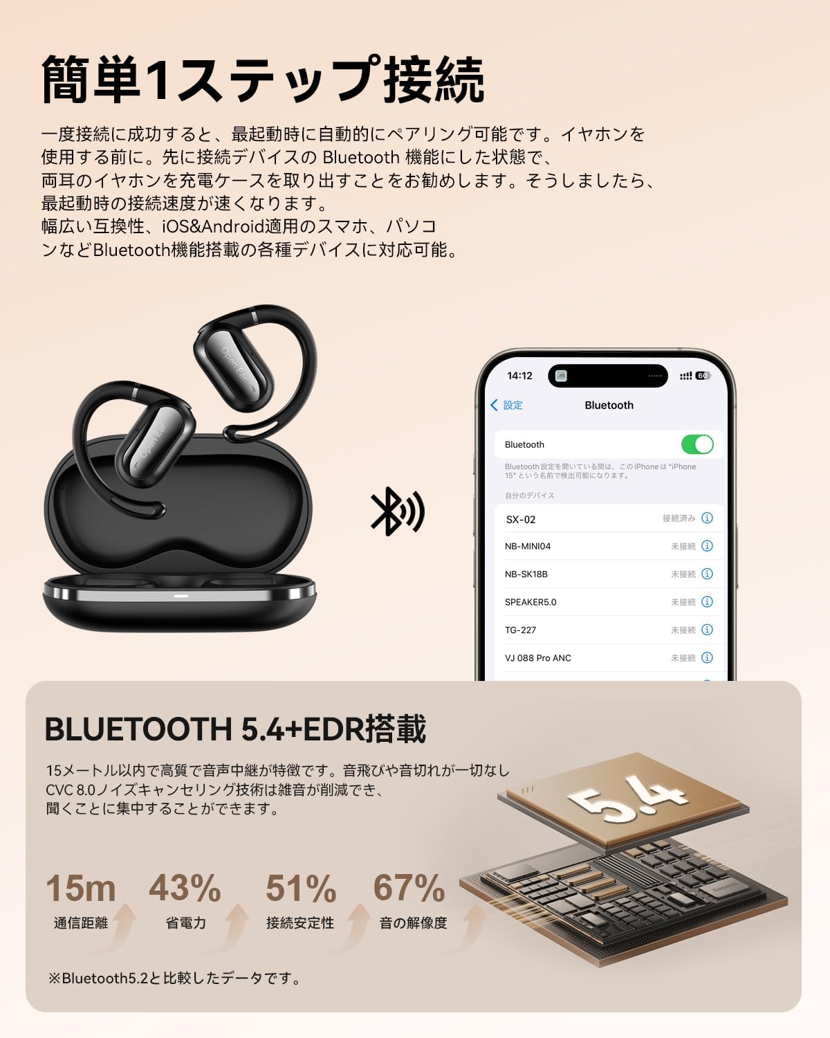 * 【Bluetooth 5.4+EDR 瞬時自動ペアリング & 優れた互換性】Bluetooth 5.4の遅延が低く、航続が長く、耐干渉性が高い。電池寿命・範囲を飛躍的に向上し、音飛びや途切れ、遅延、ノイズなどが最小限に抑えられ、安定した通信を実現しています。iOSやAndroid、Windows、タブレットとの互換性も向上しており。瞬時にペアリングする手順:①イヤホンを取り出す。②BLUETOOTHをオンにする。③自動ペアリング 初回ペアリング後、2回目の使用で、蓋を開けて携帯電話に自動的に接続できます。