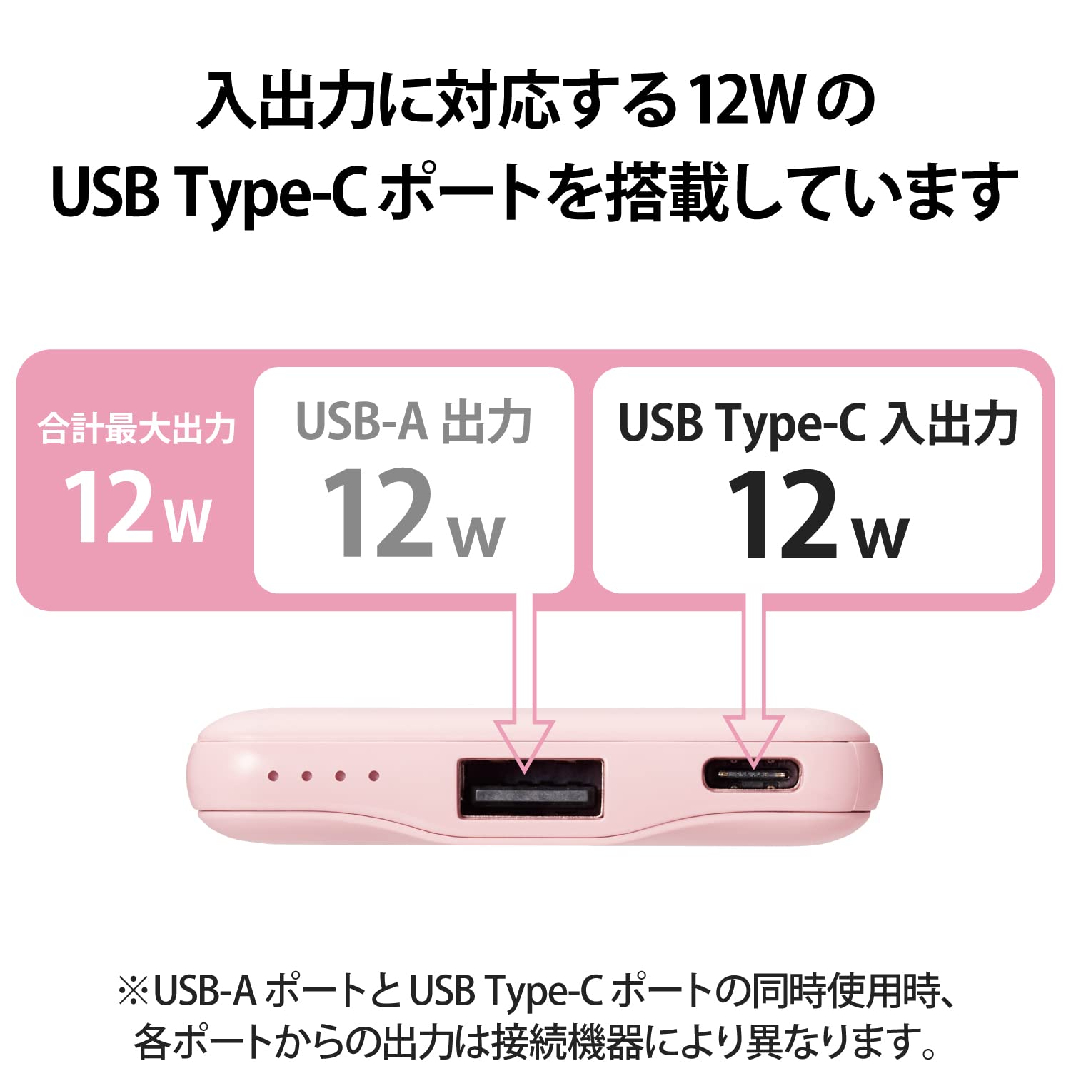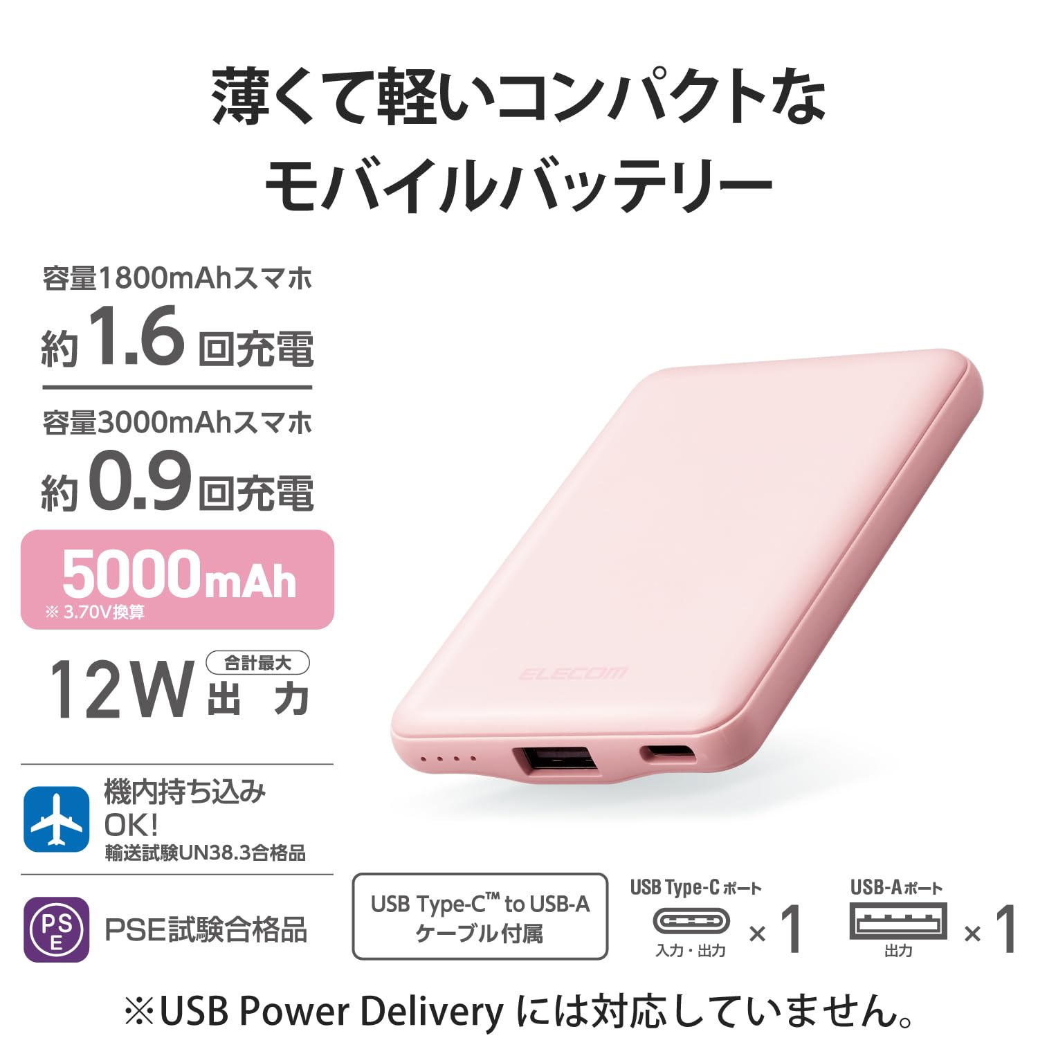 エレコム モバイルバッテリー 5000mAh 12W コンパクト 薄型 軽量 入力(Type-C×1) 出力(Type-C×1、USB-A×1) PSE認証 おまかせ充電対応 【iPhone Android 各種対応】 ピンク DE-C37-5000PN