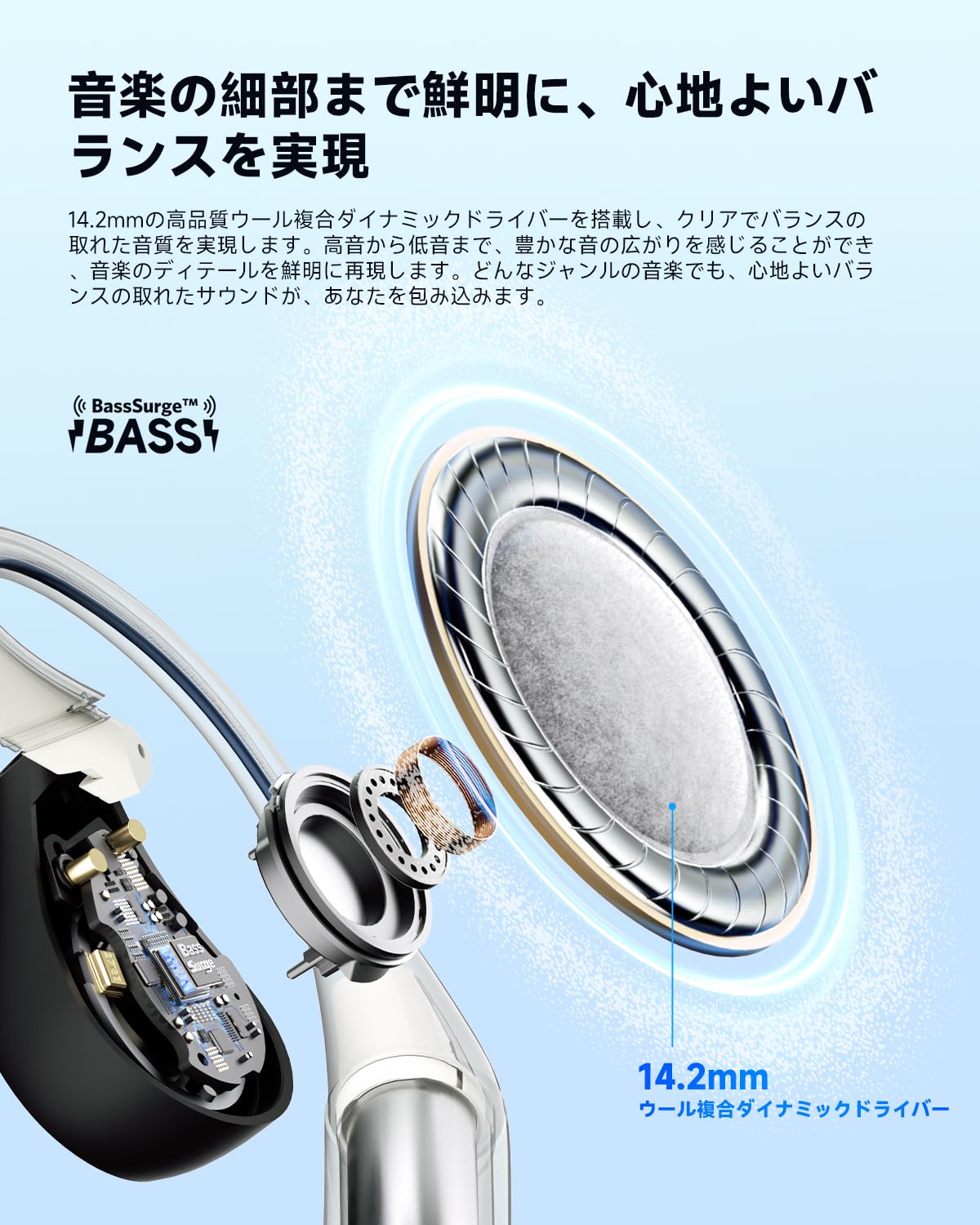 * 【豊かな音のディテールと迫力の低音を再現】独自開発の低音増強技術「BassSurge」により、深みのある重低音を実現。さらに、14.2mmの高品質ウール複合ダイナミックドライバーは、クリアでバランスの取れたサウンドを奏でます。高音から低音まで、幅広い音域を忠実に再現し、音楽の細部までしっかりと感じていただけます。