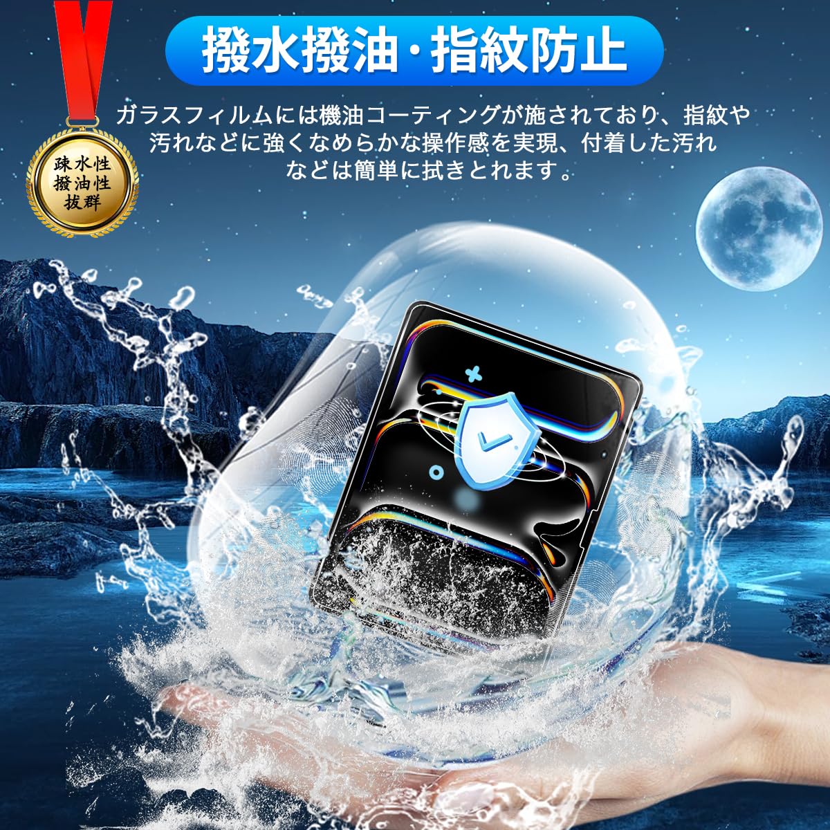 * 【撥水撥油・指紋防止】 対応 iPad Pro 13インチ 保護フィルム 採用して AFコーティングにより保護フィルムの表面に撥水撥油防汚機能を付与しており、指紋や汚れの跡が画面に付きにくく、きれいな状態に維持されます。改良されたコーティング加工により、指紋などがつきにくく、画面がなめらかとなり快適な操作することができます。(付着した指紋、水滴、汗、化粧品などは簡単に拭き取れます)