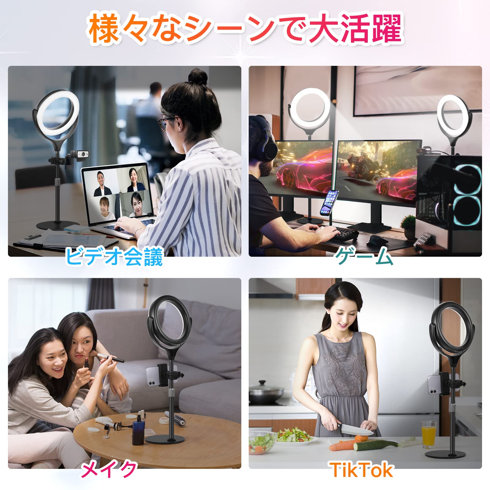 * ①【Zoom・オンライン会議での印象アップ】 コンパクトでおしゃれな8インチLEDリングライト。卓上や勉強机、テーブルにも置けるデザインで、寝室やベッドサイドにもぴったり。明るく自然なライトが、Zoom会議やWeb面接でも顔をはっきりと照らし、第一印象をグッと高めます。配信や在宅ワークのデスクライトとしてもおすすめです。