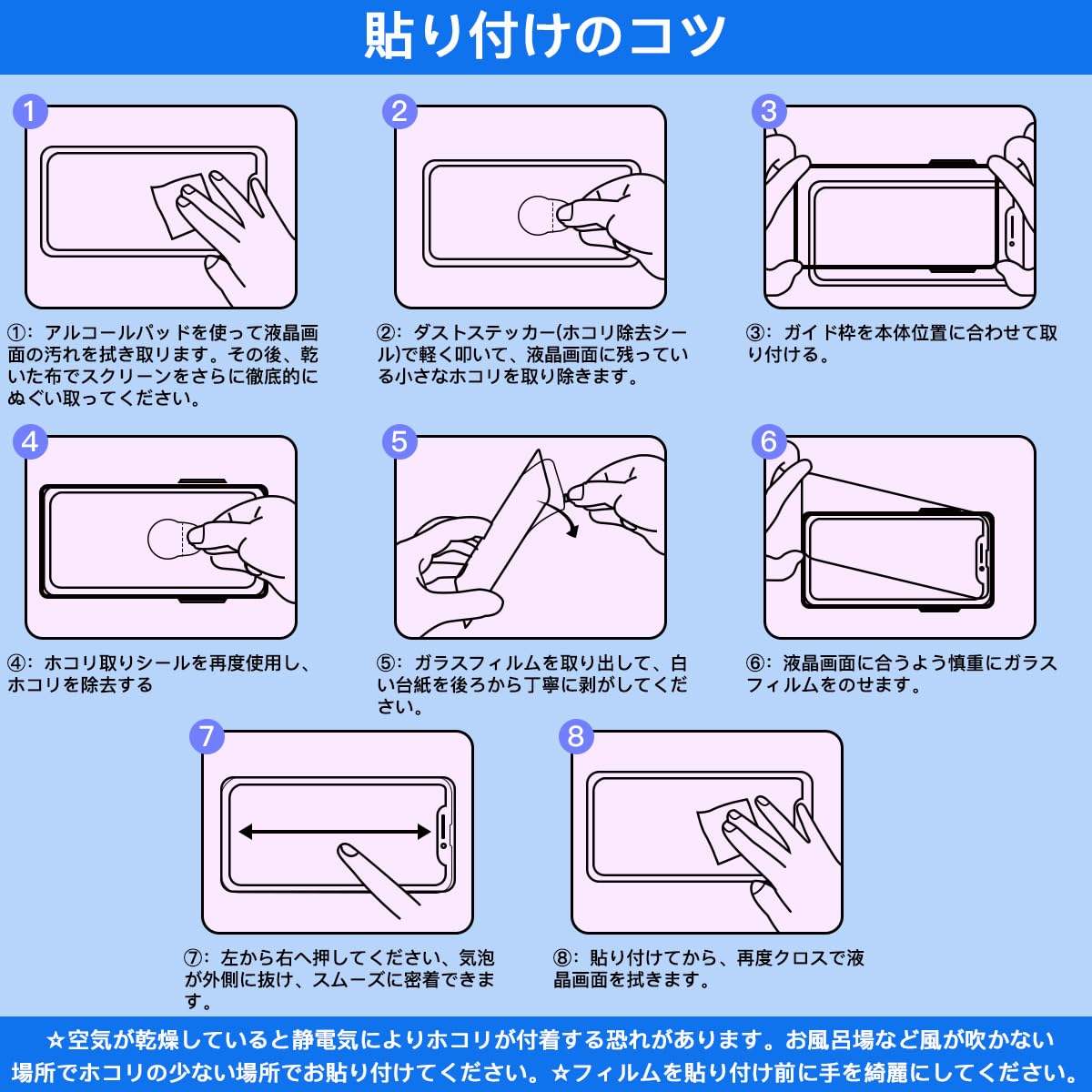 * <ヒント>◆少量の気泡/接着剤が残る場合、 クリーニングクロスを使って、その位置で繰り返して拭きながら画面を押して、 取り除くことができます。◆広い範囲の気泡が残っている場合は、 ガラスフィルムを軽く持ち上げて、気泡をガラスフィルムの外まで押し出してから、再吸着してください。
