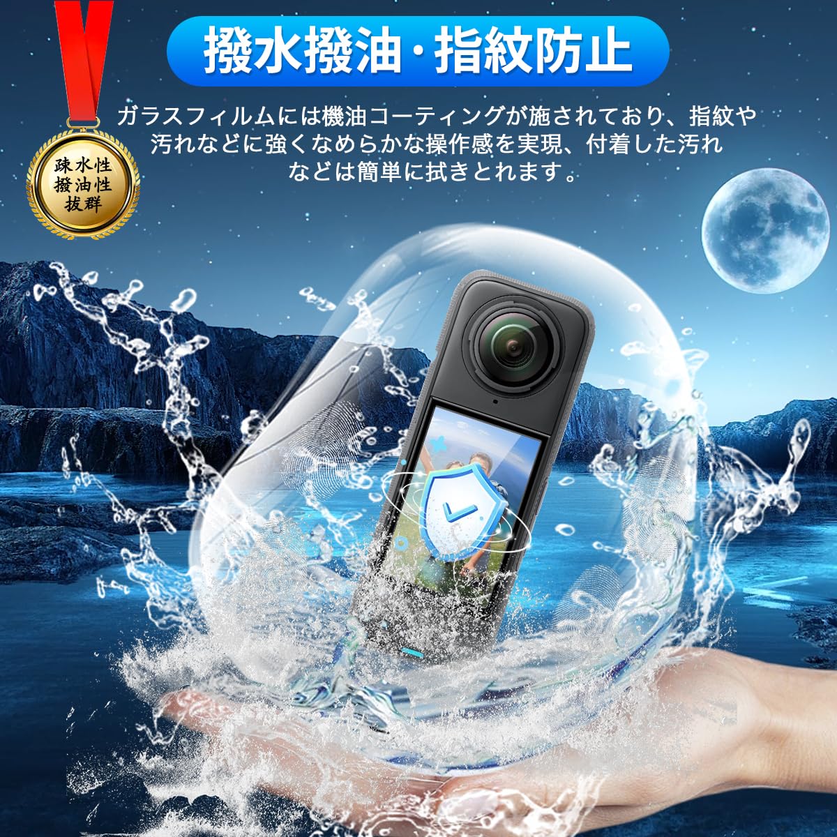* 【撥水撥油・指紋防止】 対応 インスタ360 X4 保護フィルム 採用して AFコーティングにより保護フィルムの表面に撥水撥油防汚機能を付与しており、指紋や汚れの跡が画面に付きにくく、きれいな状態に維持されます。改良されたコーティング加工により、指紋などがつきにくく、画面がなめらかとなり快適な操作することができます。(付着した指紋、水滴、汗、化粧品などは簡単に拭き取れます)