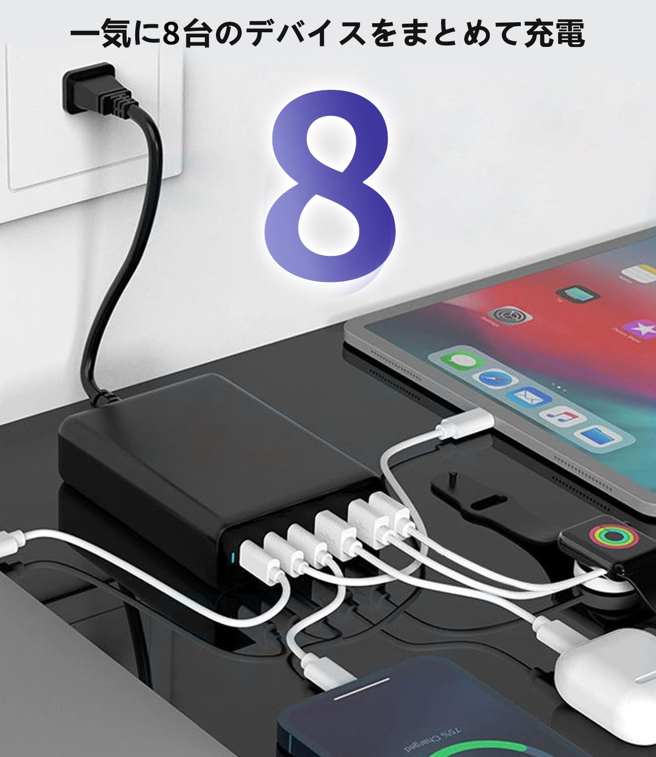 * 【単一ポートでも8ポート同時でも、2*100W高出力を維持】USB PD 3.0に対応し、2つポートで最大100Wの出力に対応しています。USB-C1&USB-C2ポートは常にPD3.0で100Wの高出力を維持し、複数デバイスを同時に充電しても出力配分によるパワーダウンの心配がありません。真の「100W Max」を実現しました。