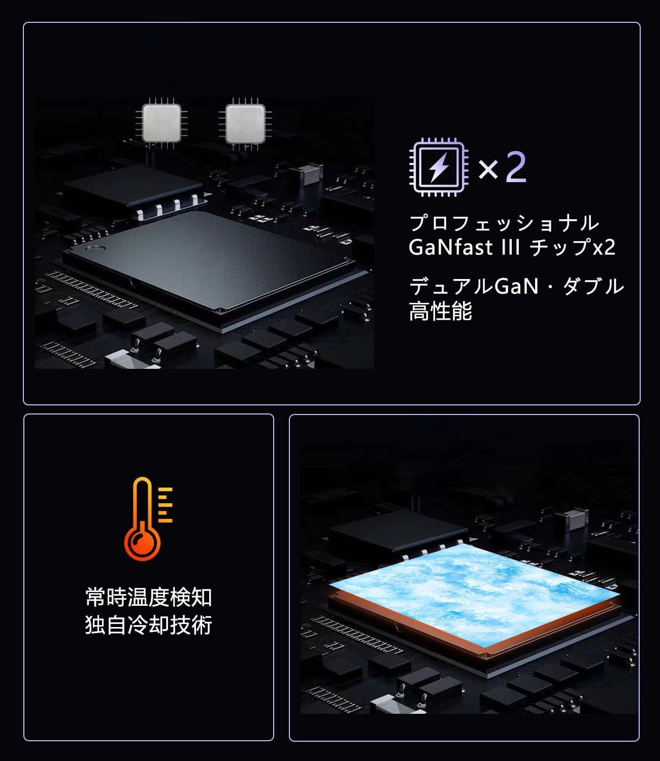 * 【ダブルGaNFast IIIチップ採用】進化したGaNFast IIIチップを2つ採用し、独自の冷却安全技術と組み合わせることで、電力密度の限界を押し上げつつ、効率も向上させました。エネルギー使用量の低減とフットプリントの小型化を通じて、設計の迅速化とシステムの低発熱化を実現しました。環境省では、高品質窒化ガリウム(GaN)を活用し、社会のあらゆる場面でエネルギー損失を徹底的に減らし、CO2排出削減を達成することを目的に「GaN技術による脱炭素社会・ライフスタイル先導イノベーション事業」を令和3年度まで実施しました。