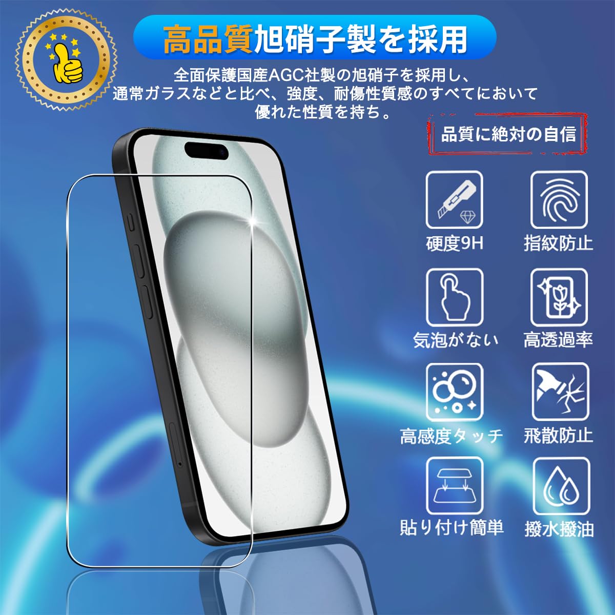 用 iphone15 ガラスフィルム 2枚 + 用 iphone 15 カメラフィルム 2枚 【ガイド枠付き 国産旭硝子素材】 表面硬度9H 対応 アイフォン15 フィルム 用 いphone15 保護フィルム 防指紋 用 いpほね15 液晶ガラス 耐衝撃 全面保護 高透過率 超薄型 気泡なし 簡単貼り付け ケースに干涉なし