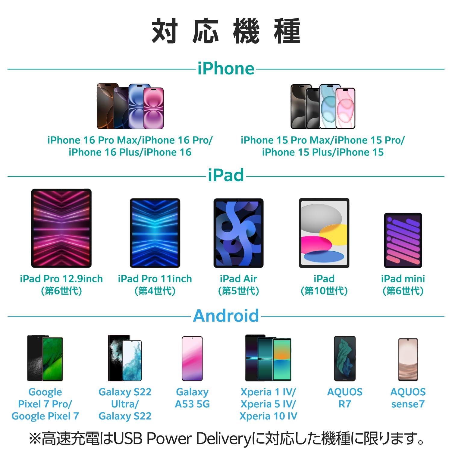 * 端末に応じて出力が5V/3A、9V/2.22Aと可変し、iPhoneなどのスマートフォンから、NINTENDO SWITCH(TM) などのゲーム機まで幅広く高速充電できます。※ NINTENDO SWITCH(TM) はドックでの充電はできません。