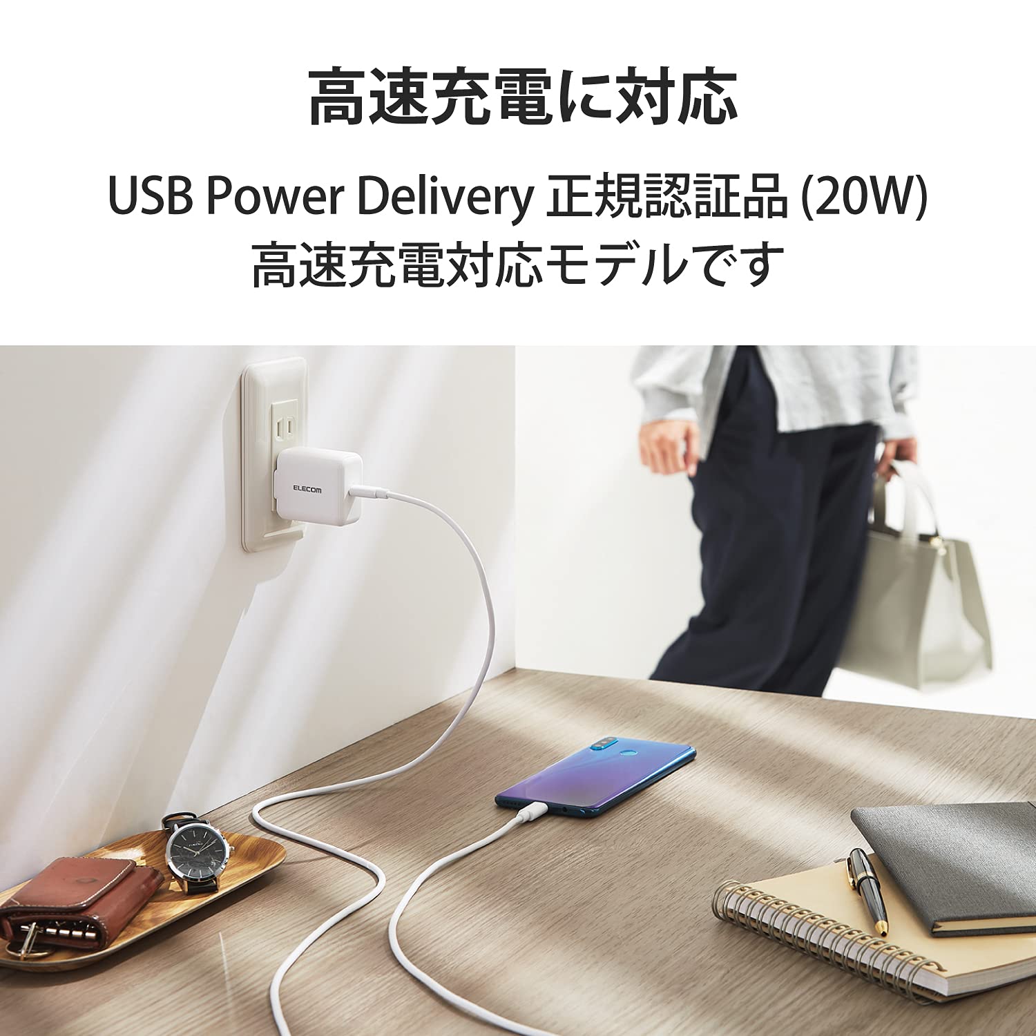 * USB Power Delivery 認証済みのUSB Type-C(TM)(USB-C(TM))ポートを搭載し、対応するスマートフォン、タブレットなどを超高速充電できるUSB AC充電器です。