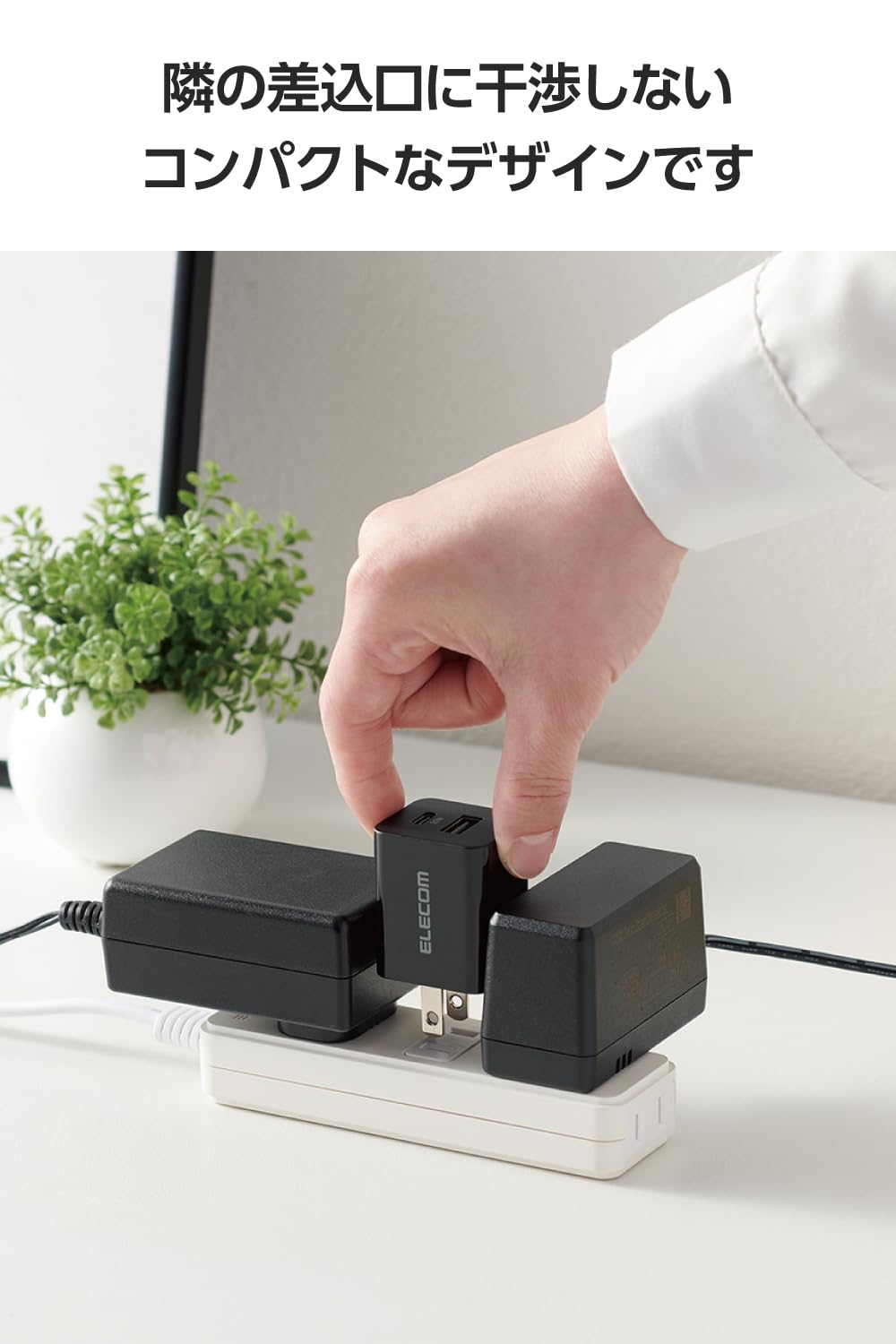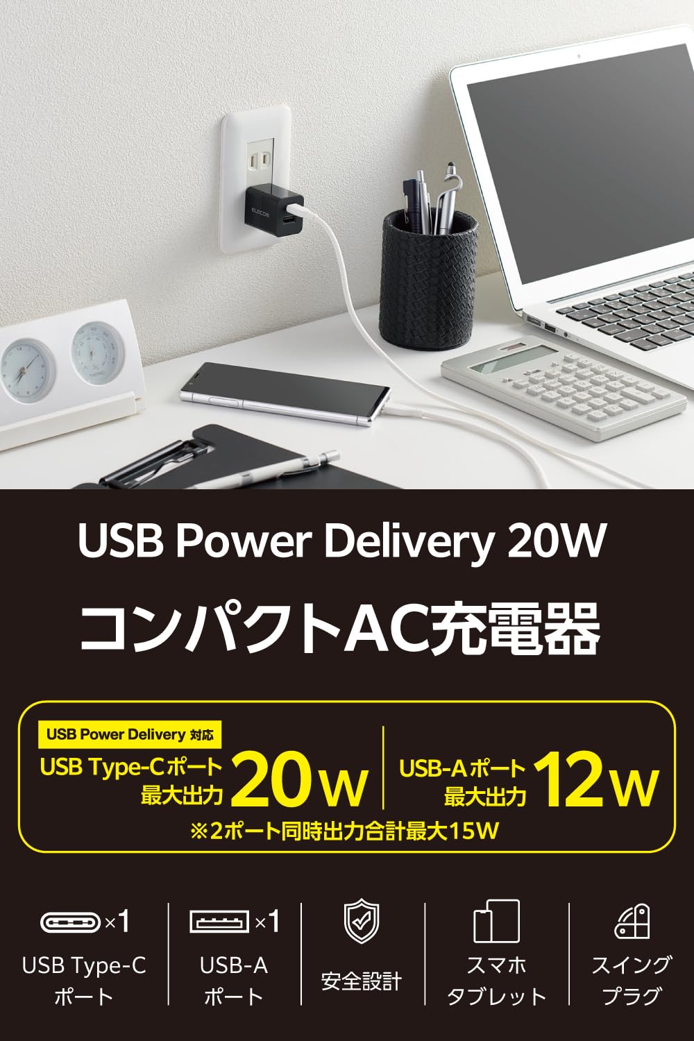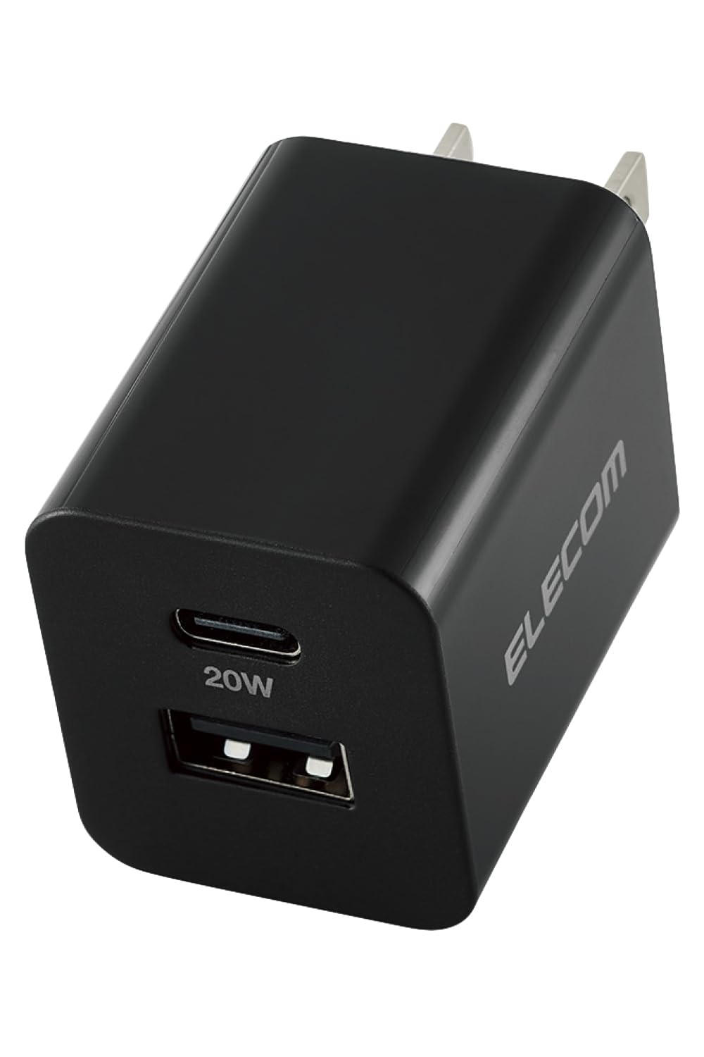 エレコム Type-C 充電器 20W USB PD対応 2ポート USB-C USB-A 【iPhone 16 15 14 Android 等対応】 ブラック EC-AC22BK
