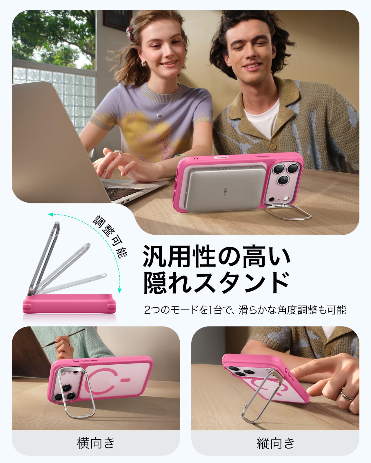 * 【受賞デザインスタンド!視聴も配信も自在】「スタンドケース、便利だけど邪魔じゃない?」いいえ、このスタンドは収納できます!必要な時だけに出し、縦置き・横置きを自由自在に調整可能で、YouTube視聴はもちろん、TikTokやInstagramの縦長動画のライブ配信にも最適です。この独創的なデザインは、フレンチデザインアワード2024年ゴールド賞を受賞しました!スタンドを使いながら、同時にMagSafe充電もでき、革命的な便利さを実現しています
