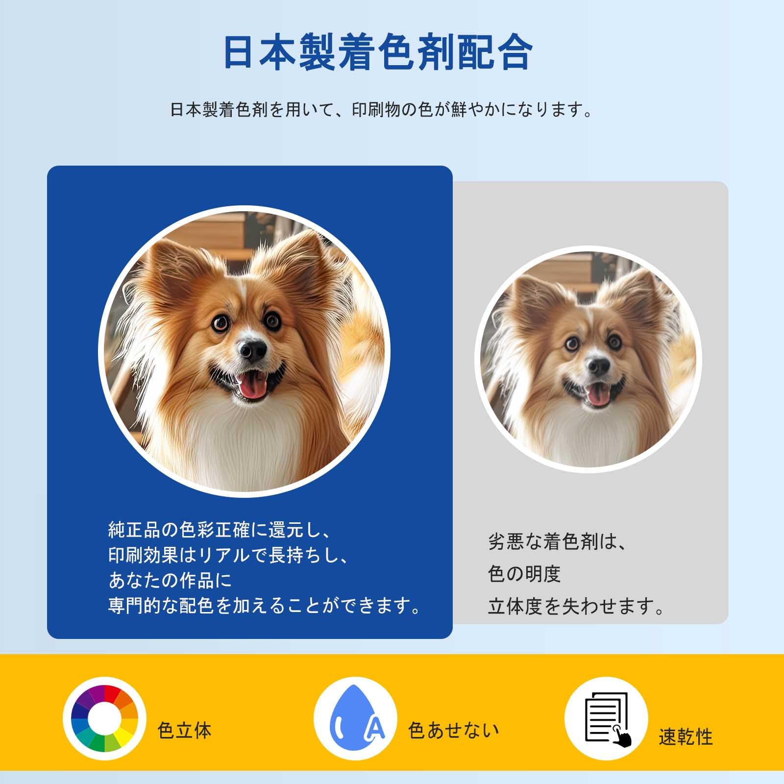 * 写真も文字もキレイに印刷:写真はもちろん、文字も高いクオリティで印刷可能。くっきりとした印刷でにじまず、読みやすい書類が作れます。年賀状などのプライベートな用途だけでなく、大事なビジネス文書もキレイに印刷することが出来、きちんとした印象をプラス。ジャンルを問わず様々なシーンの印刷に適した互換インクです。