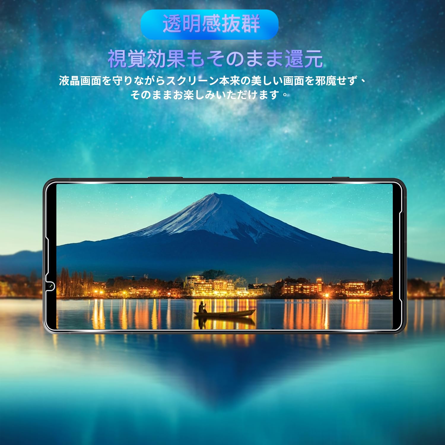 * 【高透過率 高タッチ感度】用 Xperia 1 V SO-51D / SOG10 / XQ-DQ44 フィルム スマホ 新しくアップグレードした光学プロジェクション技術を使用して、ガラスフィルムの透過率は99.9%に達し、より高い光透過率があり、超クリアな視覚体験を与えます。裸画面の視覚感があるので、映画を見るか、ドラマを見ても、効果は非常に優れます。また、本体の縁にスペースを残すデザインを取っており、ほどよいサイズ感で、液晶画面を覆いながら、スマホケースと干渉せず併用できます。フィルムは0.33mmのゴールデン厚さを設計し、指紋ロック解除 などのタッチが敏感で、正しく連続的なタッチ使用体験を確保します。使い心地が良くなるだけでなく、頑丈さも増し、見た目もより良くなる点がメリットとして挙げられます。