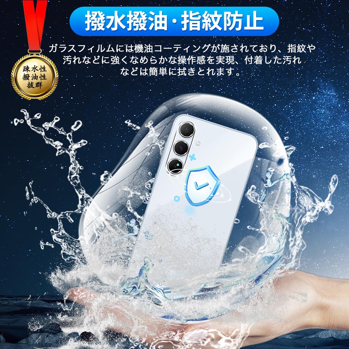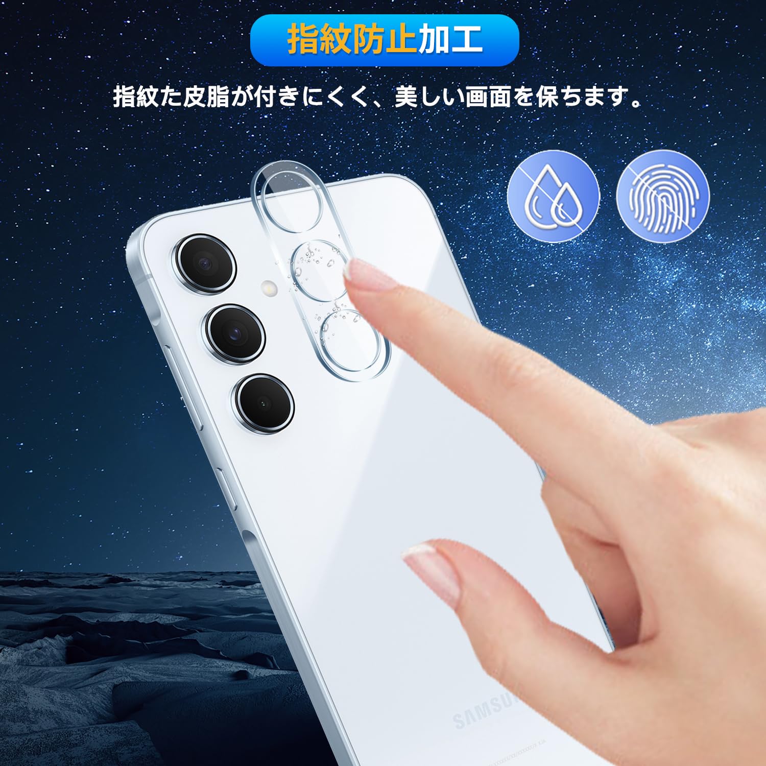 * 【撥水撥油・指紋防止】 対応 Galaxy A55 レンズ 保護フィルム 採用して AFコーティングにより保護フィルムの表面に撥水撥油防汚機能を付与しており、指紋や汚れの跡が画面に付きにくく、きれいな状態に維持されます。改良されたコーティング加工により、指紋などがつきにくく、画面がなめらかとなり快適な操作することができます。(付着した指紋、水滴、汗、化粧品などは簡単に拭き取れます)