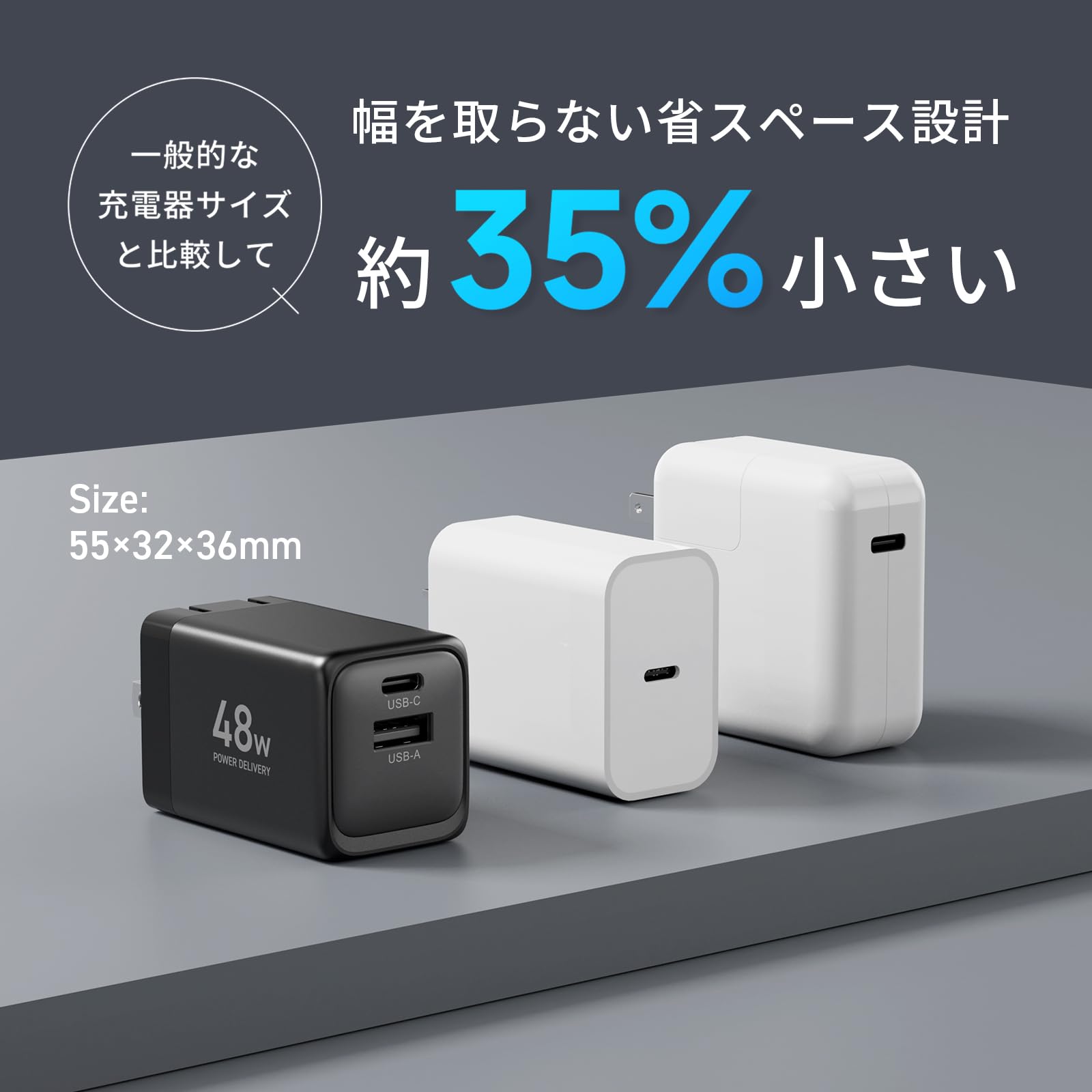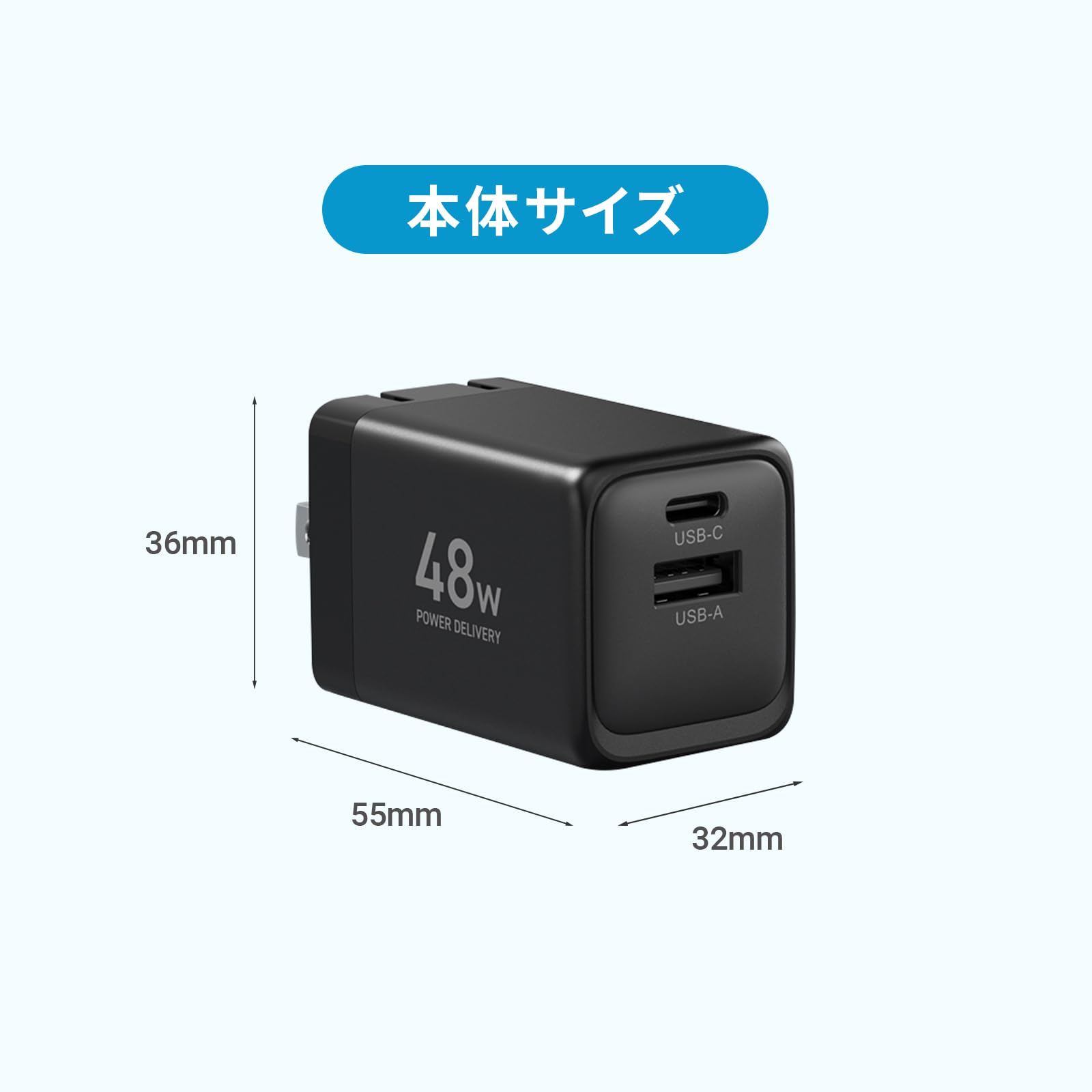 * 【商品仕様】◇本体サイズ:幅5.5×奥行3.2×高さ3.6cm ◇本体重量:80g ◇出力:USB-C/USB-A◇合計出力:USB-C(45W)/USB-A(18W),2ポート同時使用(48W(USB-C:30W+USB-A:18W)) ◇保証期間:お買い上げ日より1年間(保証の範囲については、取扱説明書をご確認ください。(保証書の記載内容と異なる使い方や目的で使用されますと保証の対象外となります。また生じた損害についても弊社は一切責任を負いません。)