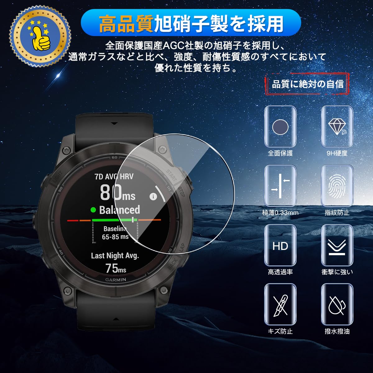 * 【高透過率 高タッチ感度】用 GARMIN(ガーミン) Fenix 7X Pro 51MM (3枚セット) 保護フィルム 新しくアップグレードした光学プロジェクション技術を使用して、ガラスフィルムの透過率は99.9%に達し、より高い光透過率があり、超クリアな視覚体験を与えます。フィルムは0.33mmのゴールデン厚さを設計し、指紋ロック解除 などのタッチが敏感で、正しく連続的なタッチ使用体験を確保します。使い心地が良くなるだけでなく、頑丈さも増し、見た目もより良くなる点がメリットとして挙げられます。