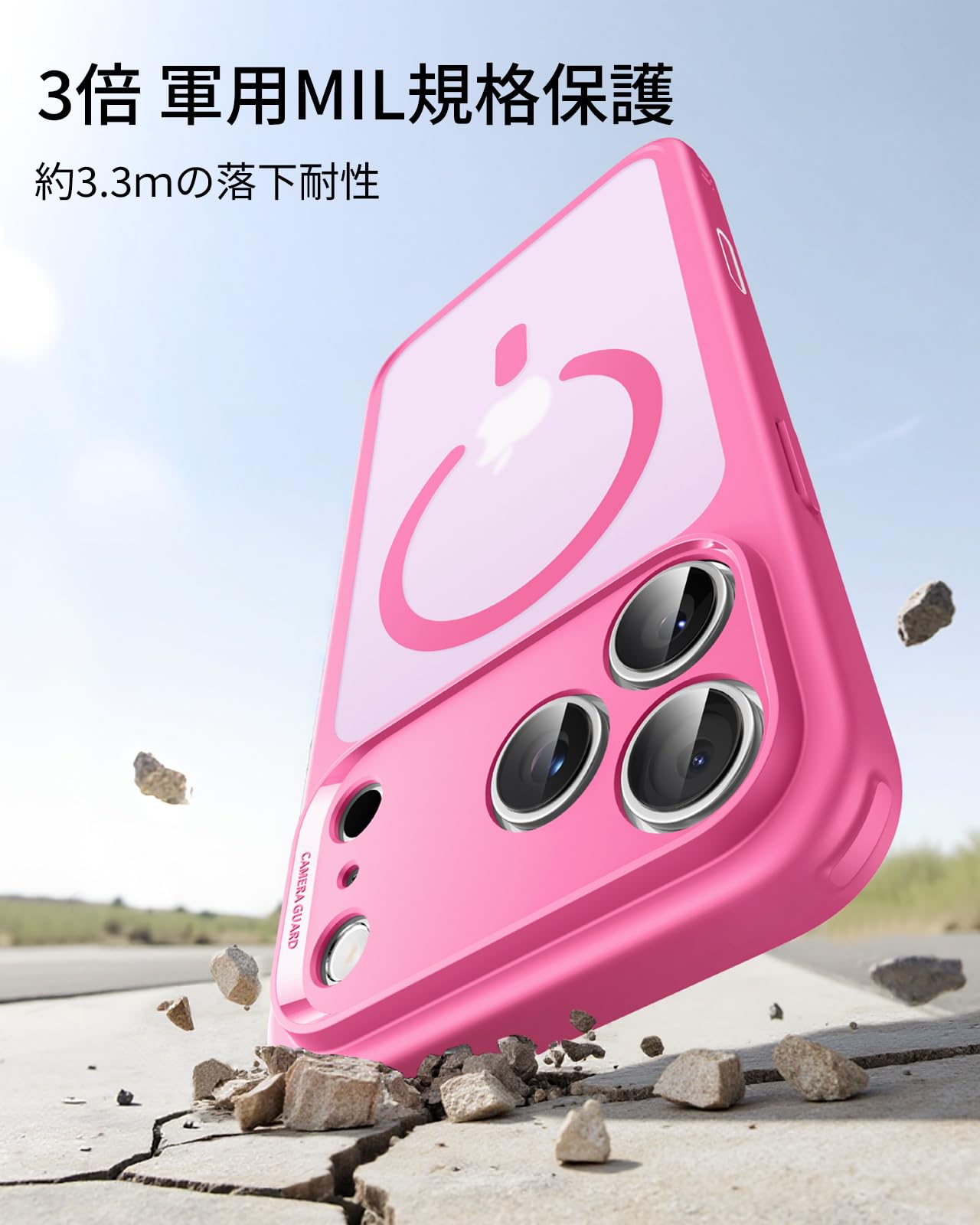 * 【軍事レベル基準!衝撃から守る全方位ガード】米軍規格MIL-STD-810Hの落下試験に合格したエアガードコーナー(認証番号:GZMR231203686802)を採用しています。このiPhone 17 Proケースは、高さ3.3メートルの落下テストにも耐久する設計で、駅のホームでの使用や登山中など、アクティブなシーンでも安心できます。うっかり落とした時も、大切なiPhoneを確実にプロテクトします