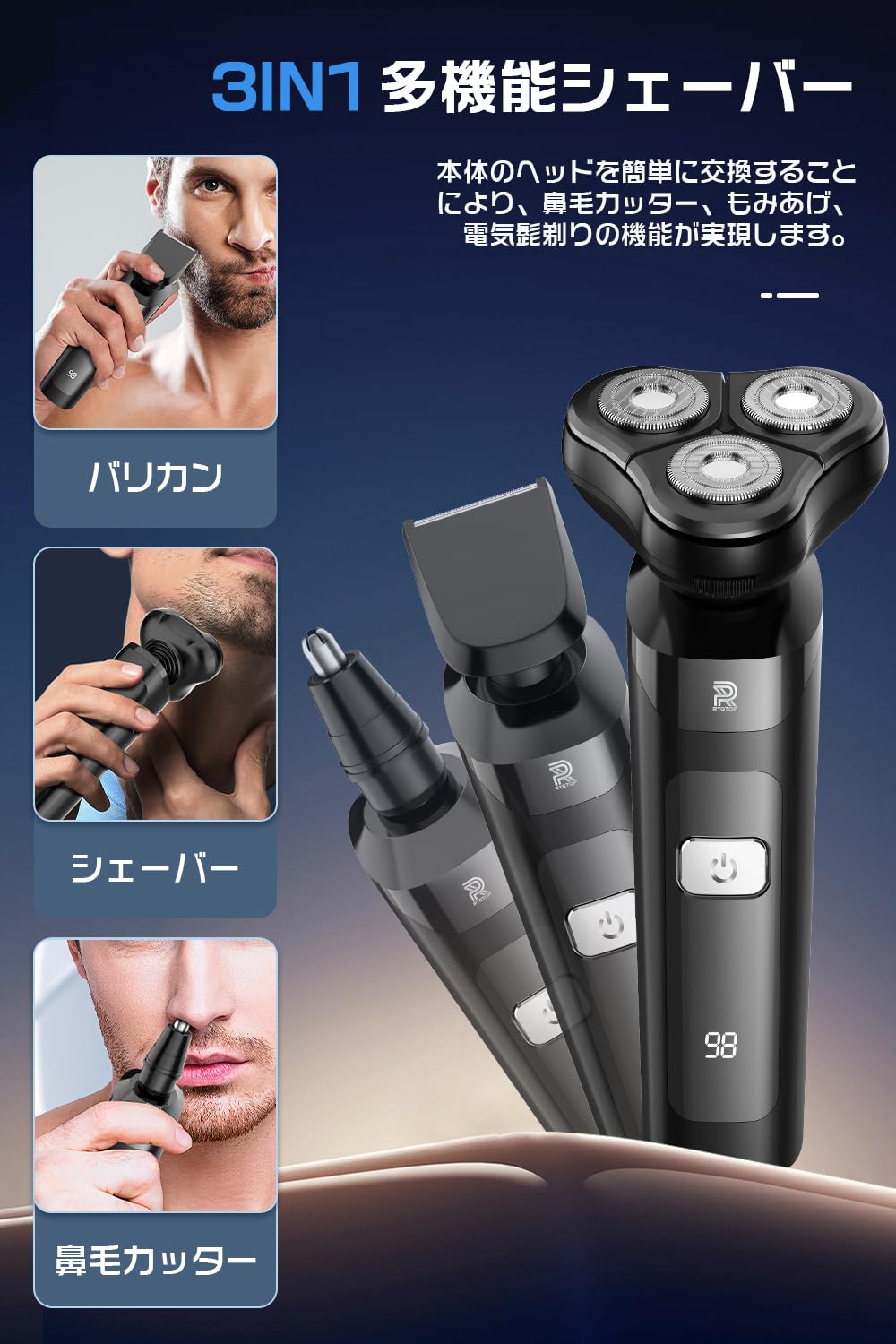 * 【3in1電気シェーバー·3D回転式360°】 メンズシェーバー は髭剃り、バリカン、鼻毛カッターの3つの機能を1台に凝縮した多機能モデルです。シェーバーヘッドでひげを剃り、バリカンヘッドで長いひげや体毛を整え、鼻毛カッターヘッドで鼻毛を除去できます。360°回転ヘッドの設計により、顔の凹凸に密着し、快適な深剃りや早剃りが可能です。また、肌との摩擦を軽減し、より滑らかな剃り心地を実現します。