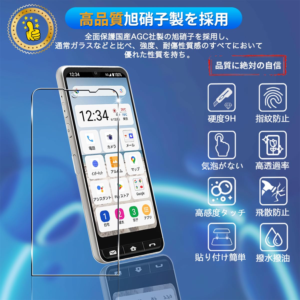 * 【撥水撥油・指紋防止】 対応 SHG12 保護フィルム 採用して AFコーティングにより保護フィルムの表面に撥水撥油防汚機能を付与しており、指紋や汚れの跡が画面に付きにくく、きれいな状態に維持されます。改良されたコーティング加工により、指紋などがつきにくく、画面がなめらかとなり快適な操作することができます。(付着した指紋、水滴、汗、化粧品などは簡単に拭き取れます)