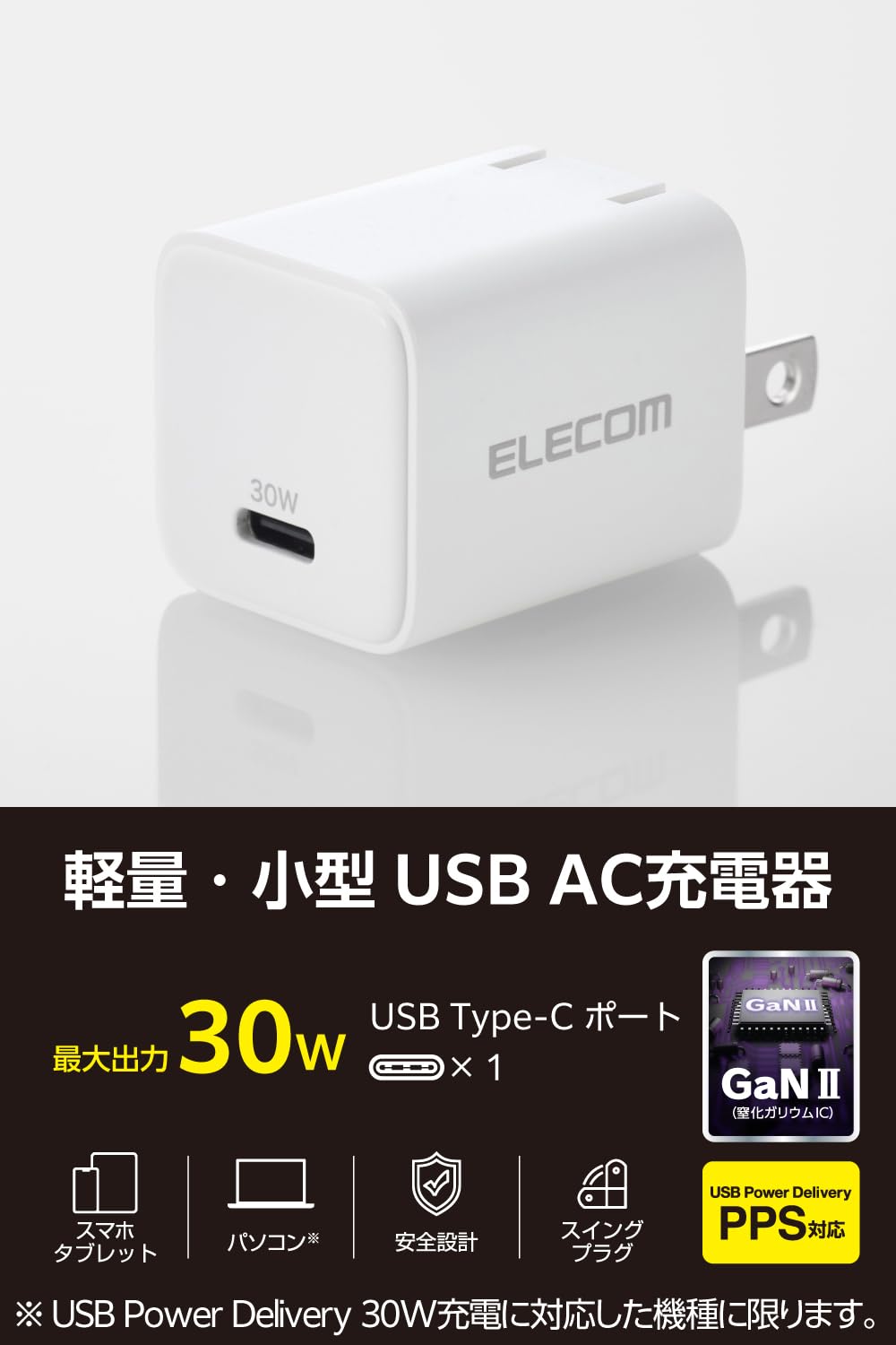 エレコム 充電器 Type-C 30W 小型 USB PD対応 GaN II 折りたたみ式プラグ PPS ホワイト EC-AC10230WH