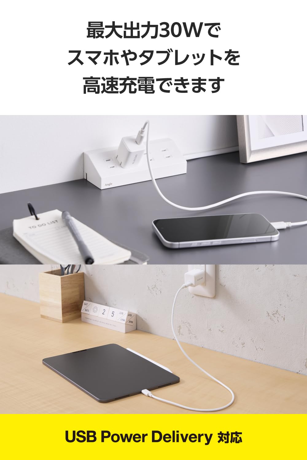 * USB Power Delivery 30Wで充電可能。Macbook Airに同梱の30W電源アダプターと同じ速度で充電できます。