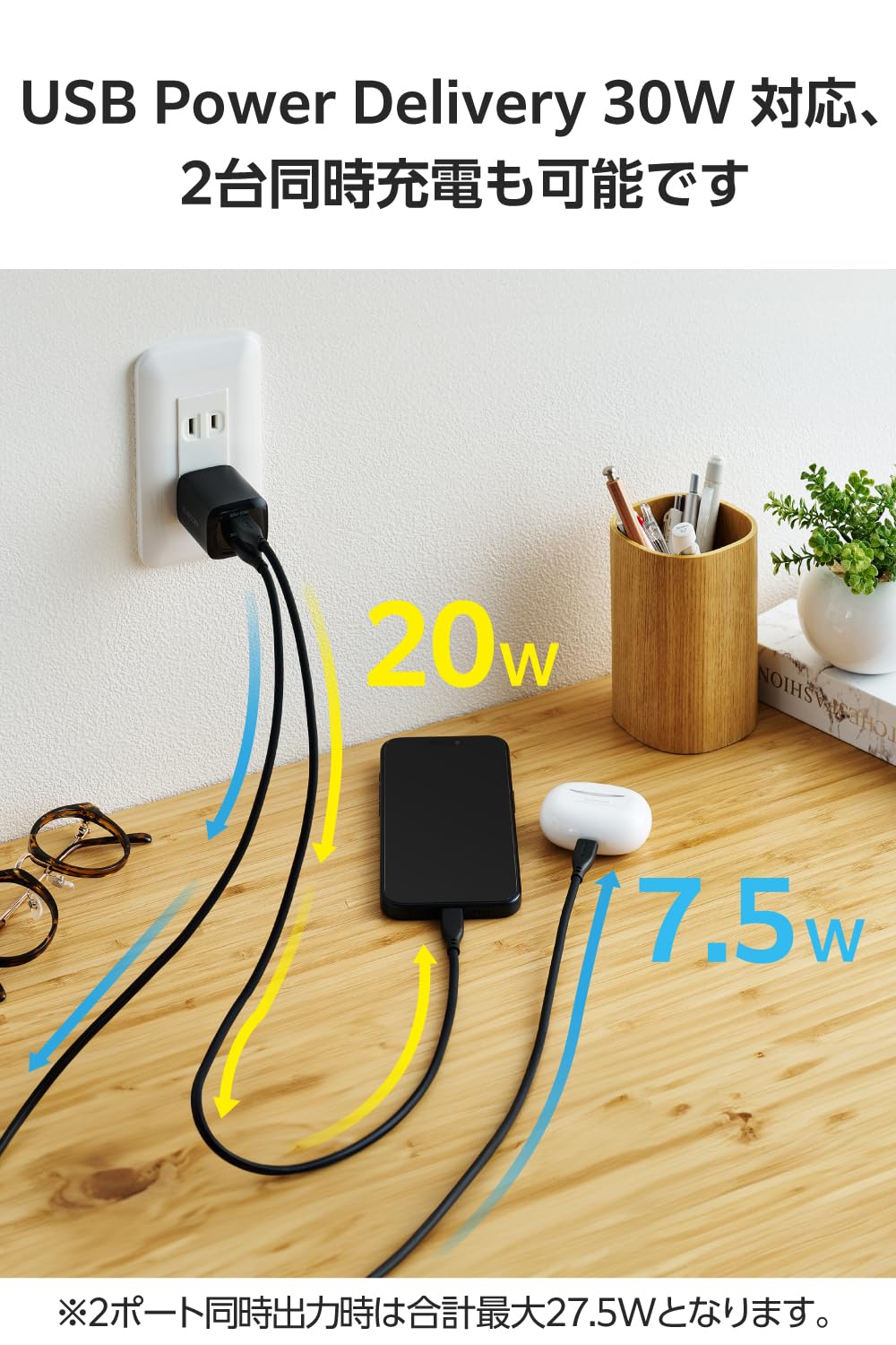 * USB Power DeliveryおよびPPS規格に対応。機器に応じて電圧、電流が変化するため、スマートフォンやのタブレットはもちろん、Windowsノートパソコンまで幅広く充電できます。