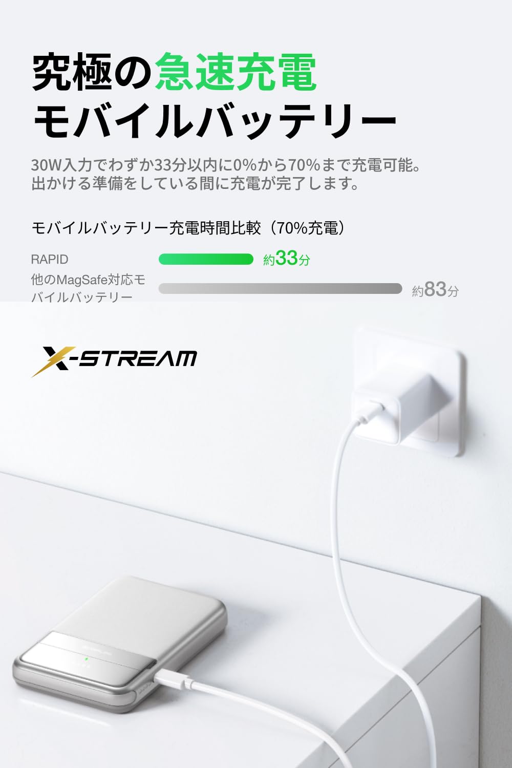 また、モバイルバッテリーに内蔵されたUSB-Cケーブルは、外出先でも30Wの高出力を実現し、急速充電が可能です。