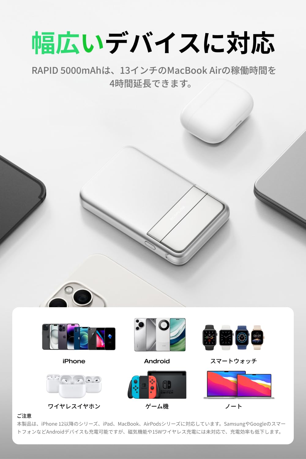 軽量ながらも高性能なバッテリー容量を備えており、外出先や旅行、日常使いにぴったり。