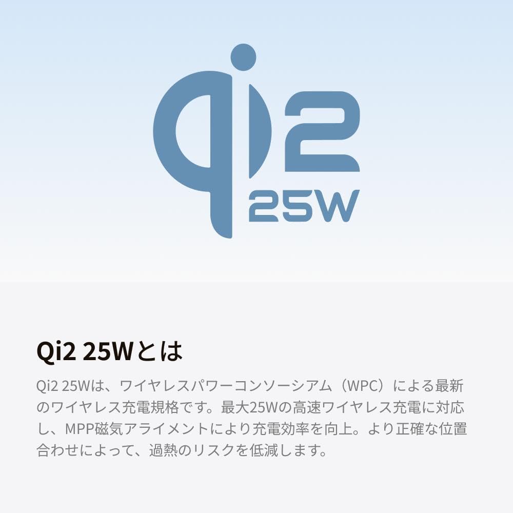 マグネットで自動吸着・自動位置合わせするため、安定した高出力を供給する Qi2 25W モバイルバッテリーです。