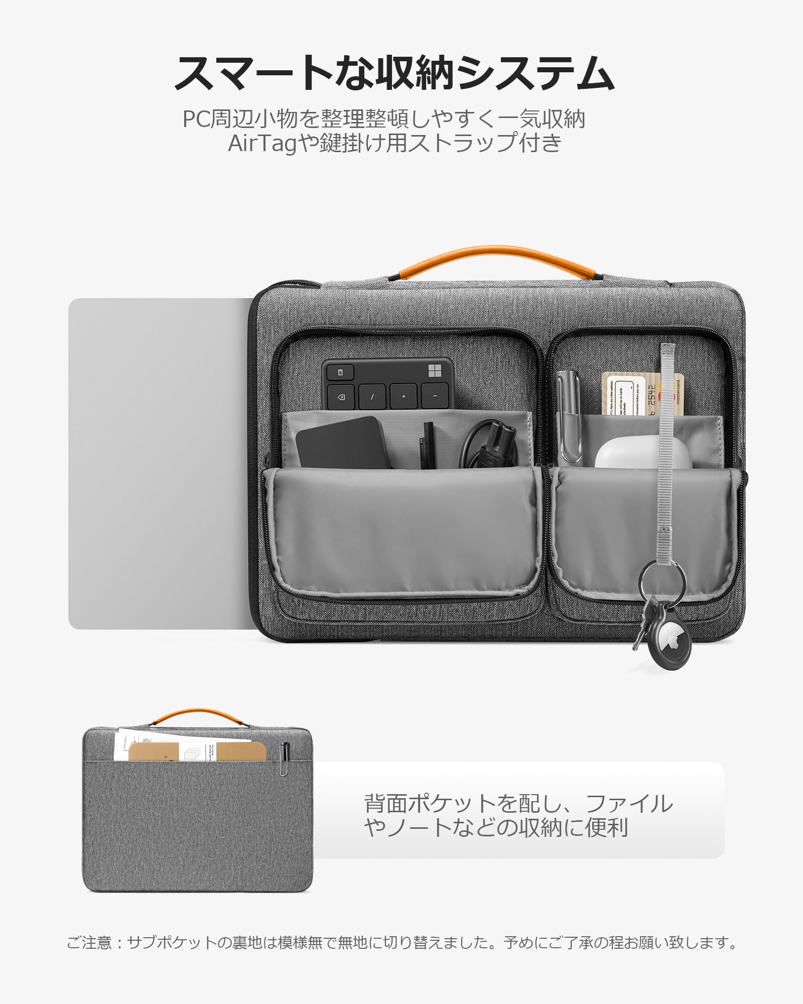 * 【スマートな3室サブ収納】このノートPCケースは二つ大きなフロントポケットが備え、その中に多数な小さいポケットやAirTag /鍵掛用ストラップを配します。電源、ケーブル、ハブ、Kindleなどのガジェットをすっきり収納できます。それに加え、背面にも大きなポケットがあり、書類やよく取り出す物の収納に適します。
