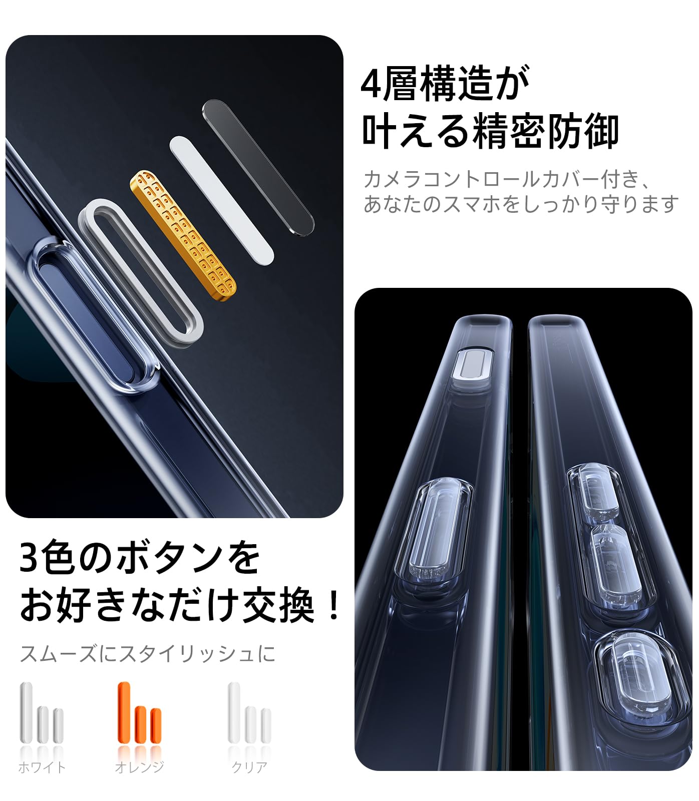 * 【3色の交換可能なボタン・自由に組み合わせ可能】スマホケースの最新デザインがついに登場した。ボタンの感触をリアルに楽しむことができる。また、鮮やかなボタン色がもう二組付属しているため、お好みに応じて組み合わせることができ、気分やシーンに応じて変えることができ、シーンに合わせたスタイルを実現する。独立ボタン設計で、iPhone 17のボタン配置に完全にフィットする。カチカチとした快適な押し心地を実現する。