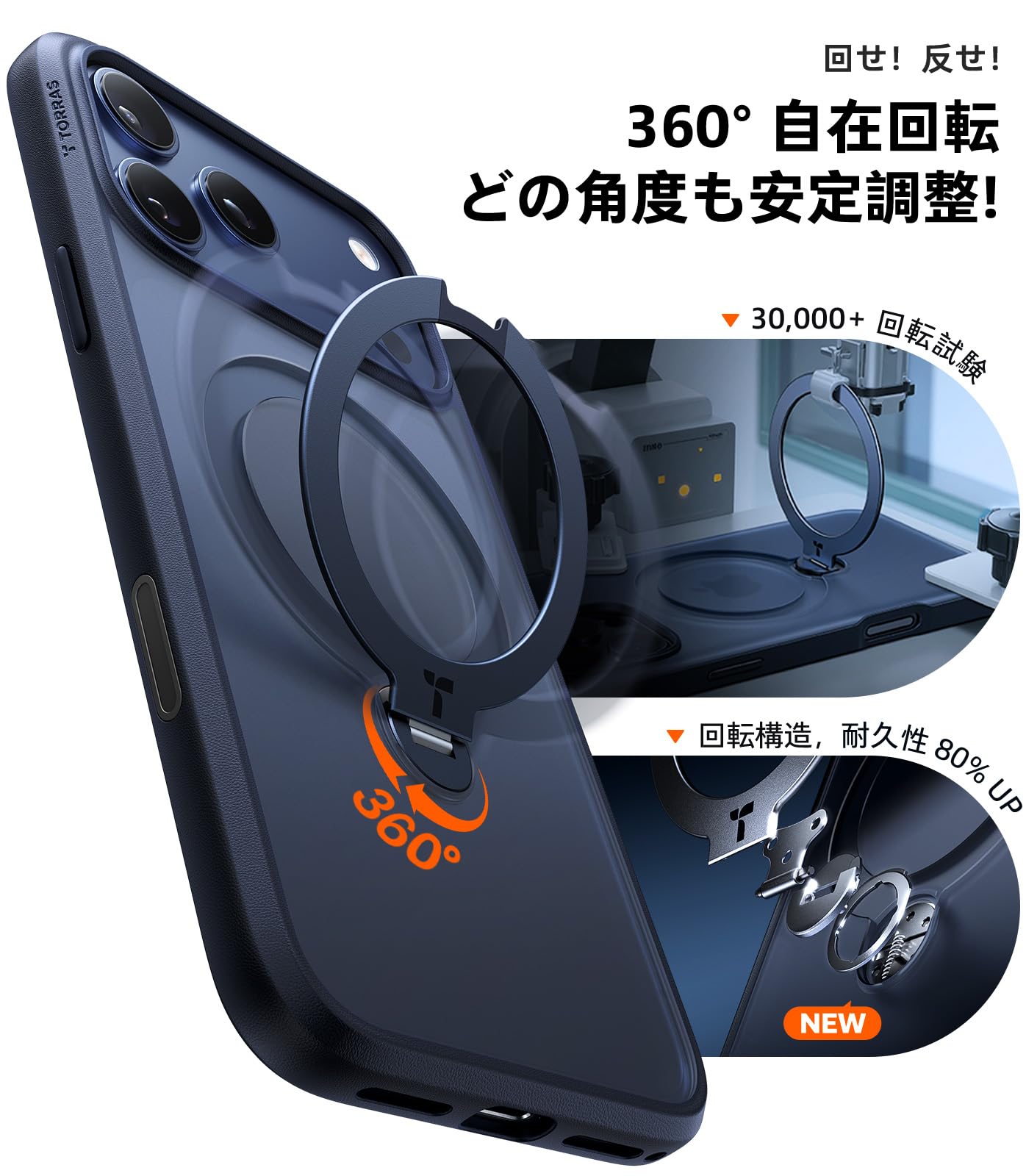 TORRAS iPhone 17 Pro 用 ケース【多機能一体・360°新定点回転スタンド】 Magsafe対応 【Ostand Q3 Spin】高耐久性 耐衝撃 ゼンマイ式スタンド リング 縦横両対応 マグネット搭載 急速充電対応 指紋防止 ミッドナイト・ブルー