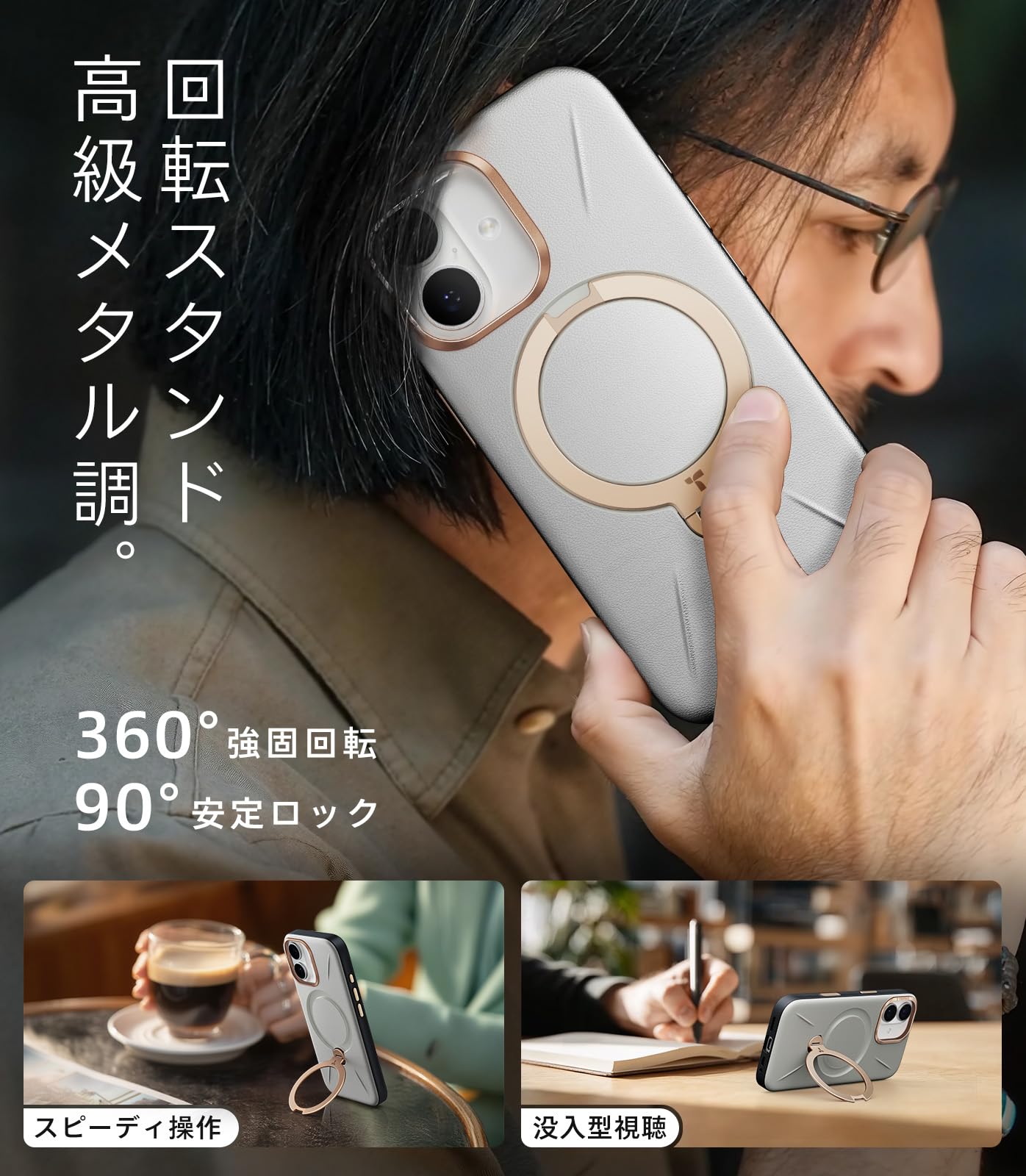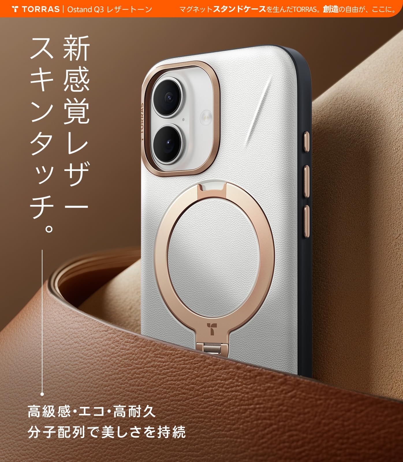 * TORRAS フラッグシップ・ハイラグジュアリー「Ostand Q3 レザートーン」は、品質と格調を求める都市エリート・ファッション先駆者のために生まれた。「パール・グレー」は、ミニマリストに捧ぐ「高級な下地」。柔霧感レザーが真珠の繊細な輝きを放ち、天然テクスチャーに霜雪のような深みがあり、光と影で層次を描く。シャンパンゴールドリングが冷グレーに温もりを添え、あらゆる場面で「目立たずとも引きつける」アクセントとなり、「侘寂」の余白哲学を伝える。*カメラコントロールボタン付き 対応機種:For iPhone 17 ケース