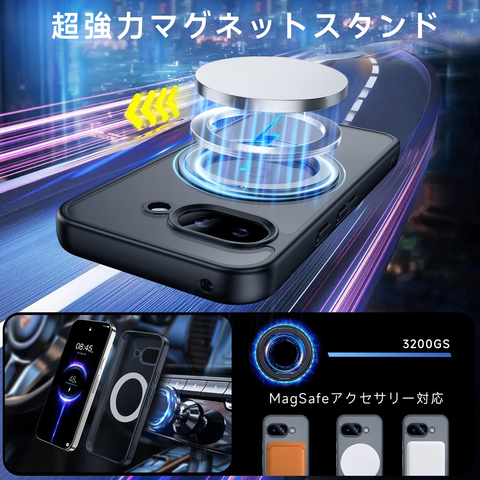 【米軍MIL規格・Magsafe対応】Google Pixel 9a 用 ケース MagSafe対応 リング 360°回転スタンド機能 縦横両対応 半透明 黄ばみ防止 ワイヤレス充電 レンズ保護 耐衝撃 携帯カバー グーグルピクセル9a カバー 6.3 インチ マグネット搭載 車載ホルダー マグセーフ対応 おしゃれ (ブラック)