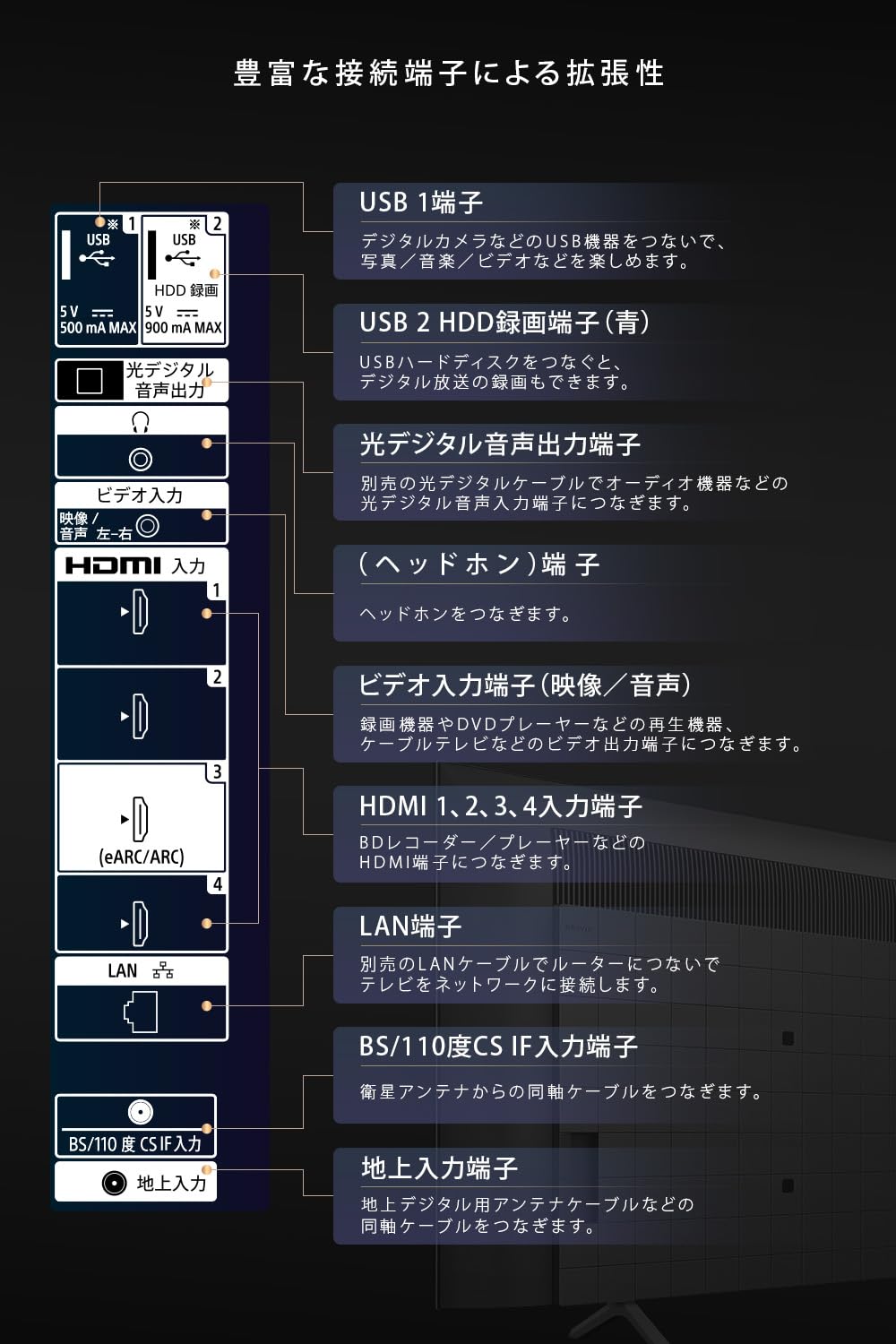 * Google TV(TM)機能搭載なので、ネット動画や音楽、ゲームなどあらゆるジャンルのアプリに対応。また音声でのコンテンツ検索やテレビの操作が可能です。