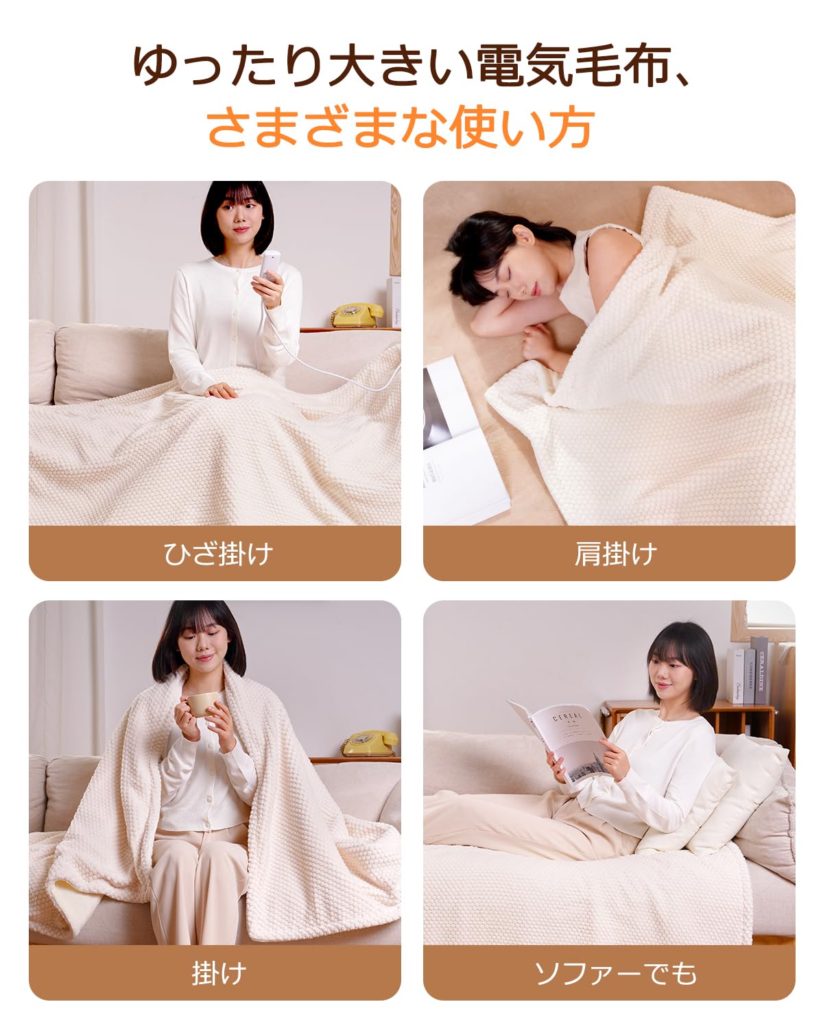 * 【掛け敷き両用·高品質ヒーター·PSE認証済み】高品質NTCヒーター線を採用し、折り曲げに強く断線しにくい設計です。掛け毛布としても敷き毛布としても使用でき、より長く、より安心して使えます。また、熱伝導率が高く、より高速かつ安定に発熱することで、朝まで安心して快適に使用できます。異常時には自動で電源がオフになるほか、9時間自動オフタイマーを搭載しているため、寝落ちしても心配不要です。お子様やご年配の方にも安心。