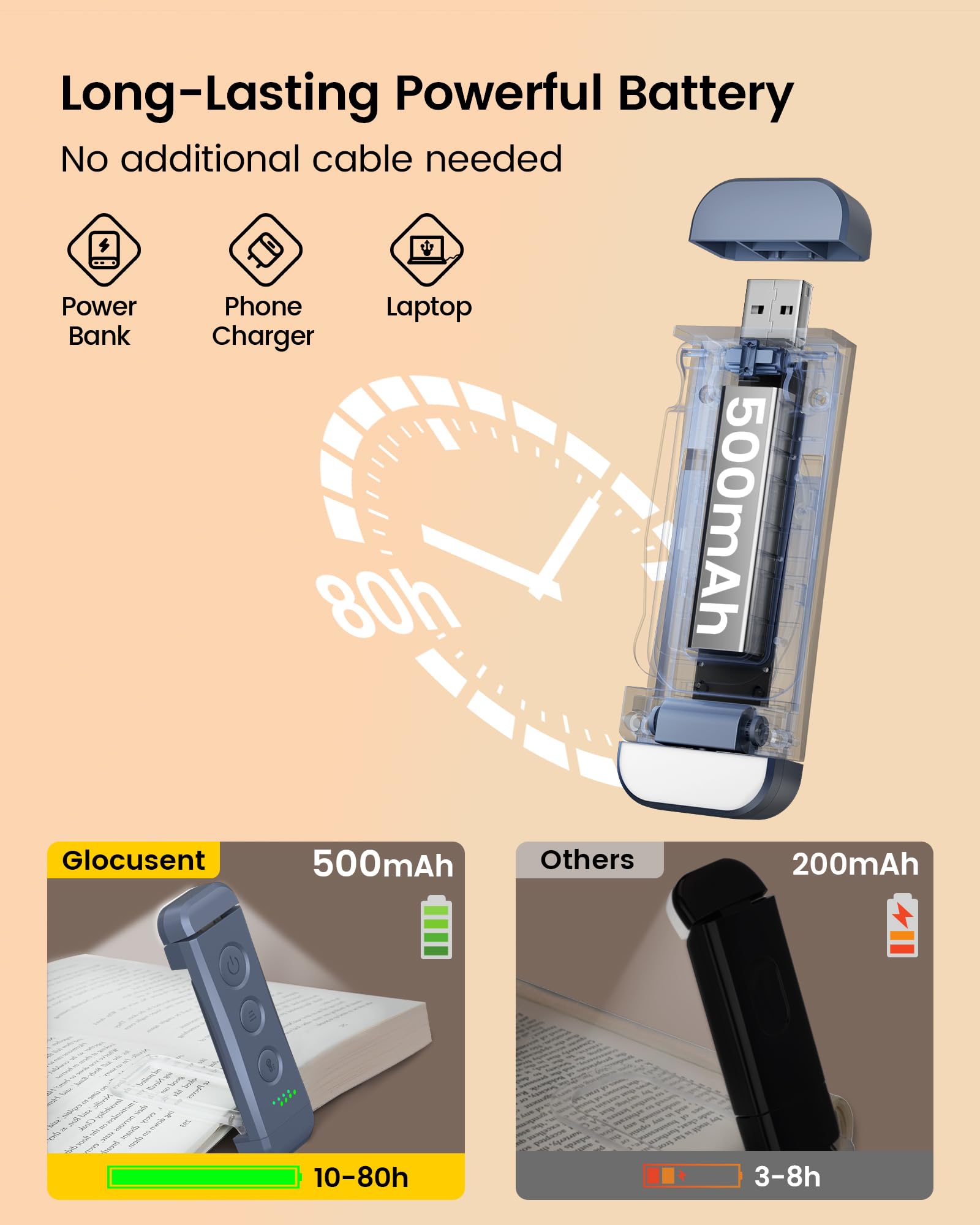 * [USB充電式 & 長持ち] 標準のUSB充電式で、コンピューター、アダプター、USBコンセントのUSBポートと互換性があります。 この充電式ブックライトには500mAhバッテリーが内蔵されており、10~80時間の読み取り時間を提供します (明るさ設定によります)。 そのため、照明設定に基づいて 1 日30 分を読むと、 20 日から3 ヶ月間読むことができます。 また、残量を表示する4つの電源インジケータがあります。