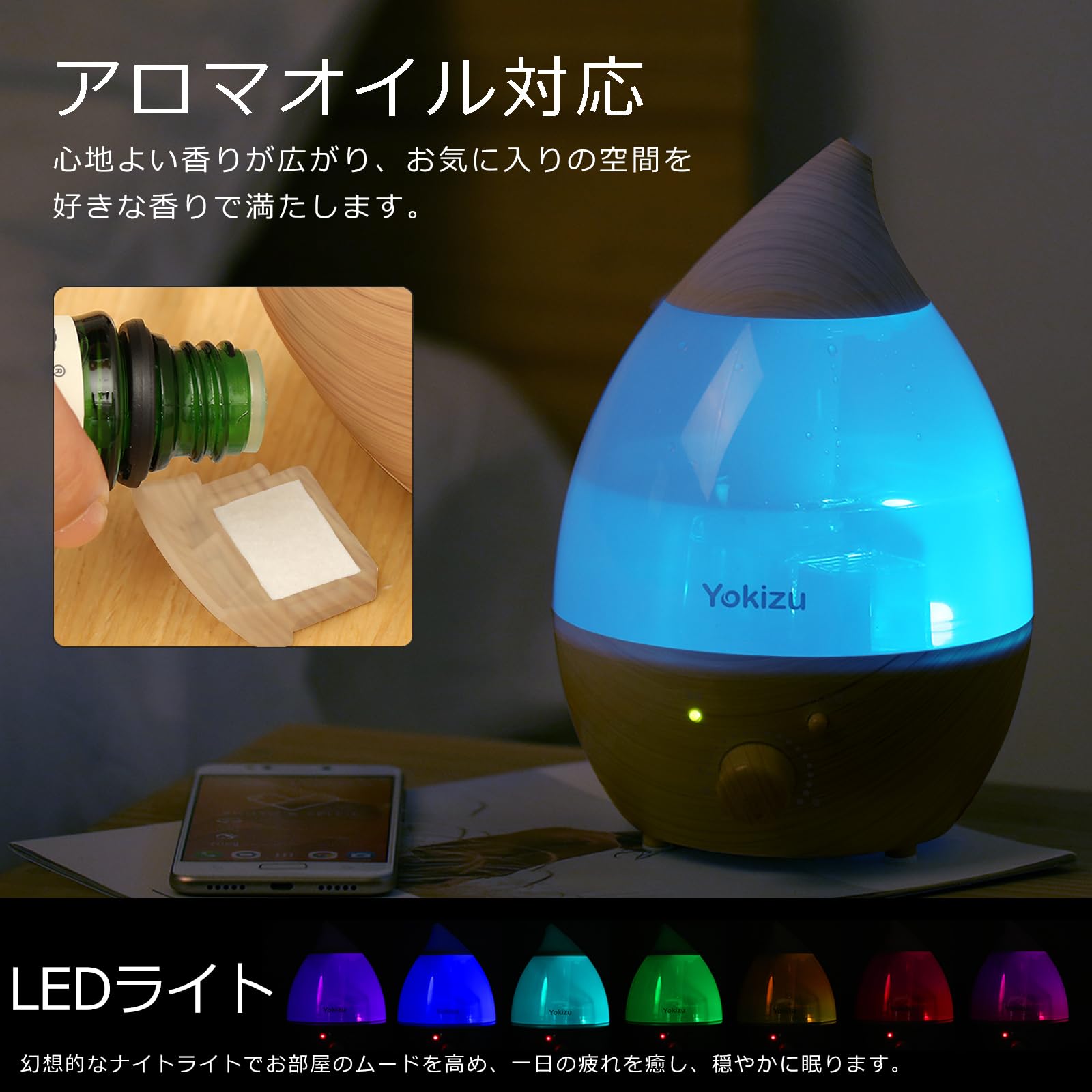 Yokizu 加湿器 小型 卓上 大容量 除菌 アロマ 超音波式 LEDライト しずく型 お手入れしやすい 静音 省エネ 加湿機 次亜塩素酸水対応 デスク オフィス 寝室 リビング 乾燥対策 焚き防止 おしゃれ コンパクト 6-10畳 木目ナチュラル
