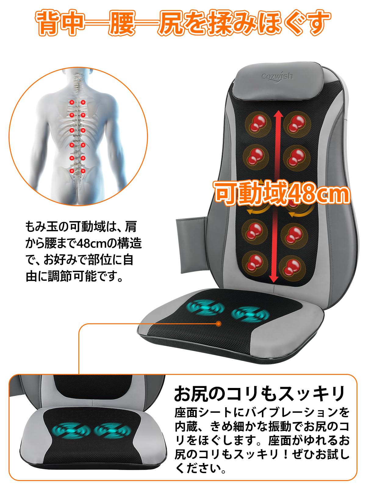 * 【上半身を自由にマッサージ】:18.9インチ(48 cm)の構造により、自分のコンディションに合わせて、疲れた背中から腰までご自由に選択し、お好み部位を重点にマッサージします。