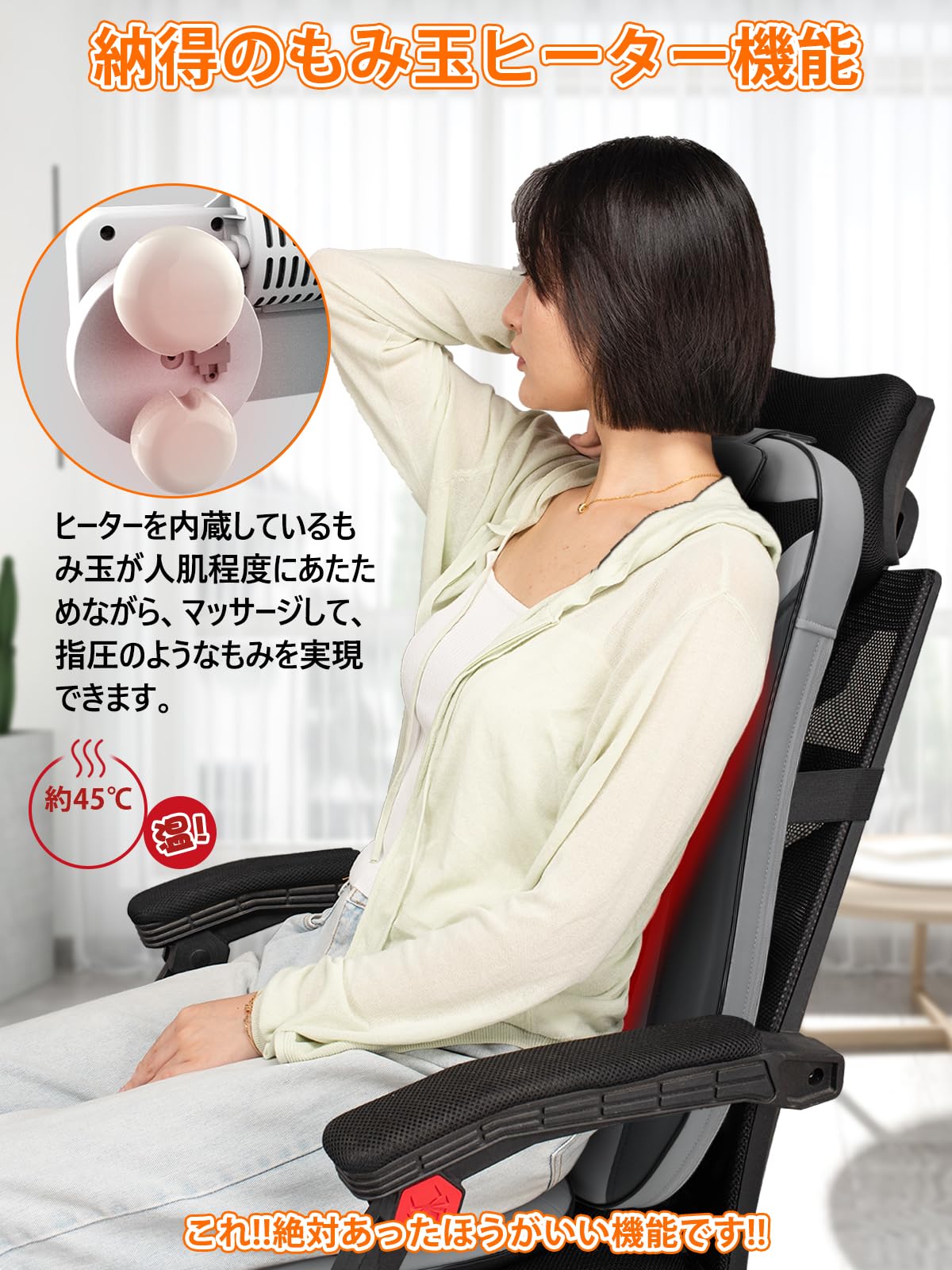 * 【暖かいヒーター機能搭載】:ヒーターを内装しているもみ玉が人肌に優しい温度(約40℃)でコリをほぐし、人の手の温もりを再現します。 体を温めながらしっかりマッサージできます。