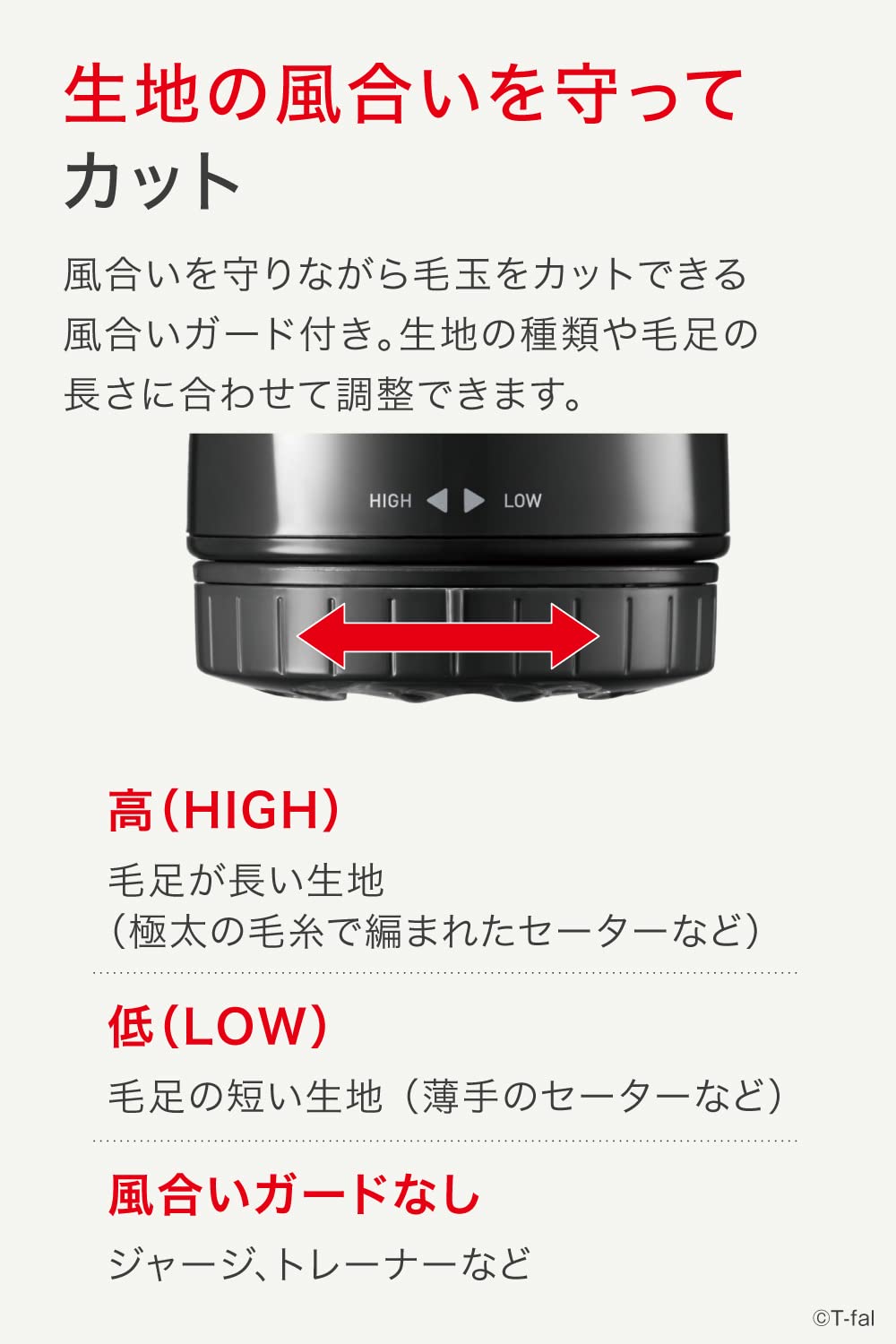 * 風合いガード:生地の風合いを守りながら毛玉をカット。ニットやジャージなど、生地の種類や毛足の長さに合わせて、高(HIGH)~低(LOW)まで調整可能。
