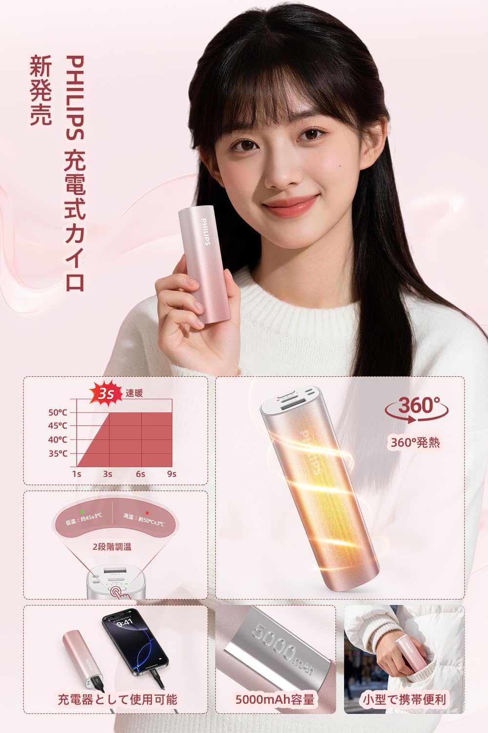 Philips(フィリップス) 充電式カイロ 2個セット 360°全方位発熱 / 3秒速暖 / 2段階温度調節 小型 軽量 usb カイロ 10000mAh モバイルバッテリー機能 電気ハンドウォーマー 携帯便利 USB充電式 寒さ対策/省エネ/PSE認証済 防寒グッズ プレゼント ピンク DLP2137DP