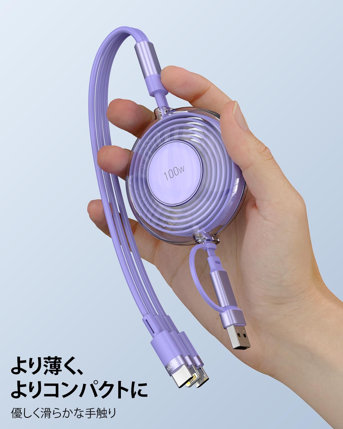【100W】3in1 充電ケーブル 巻き取り式 [1.2M PD対応/高耐久] 100W/5A 超急速充電 ライトニング/Type C/マイクロUSBコード 3台同時充電 iPhone 16 15 14 13 12、Galaxy S25 S24 S23、iPad Pro/Air/Mini、MacBook Pro/Air等多機種対応 - パープル