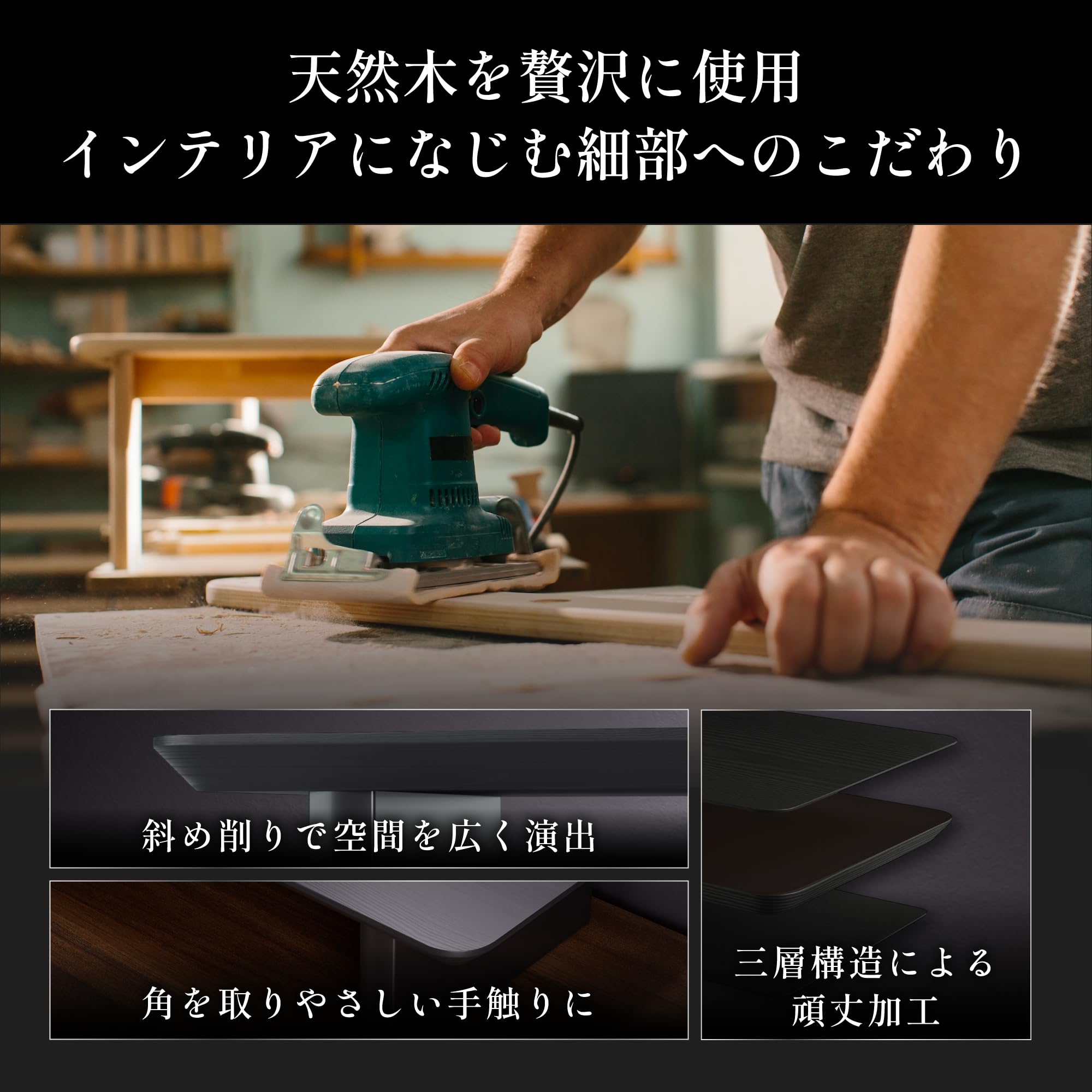 * 丁寧な処理を施した天板は、デスク周りの景観を損ねず、高級感を与えます。
