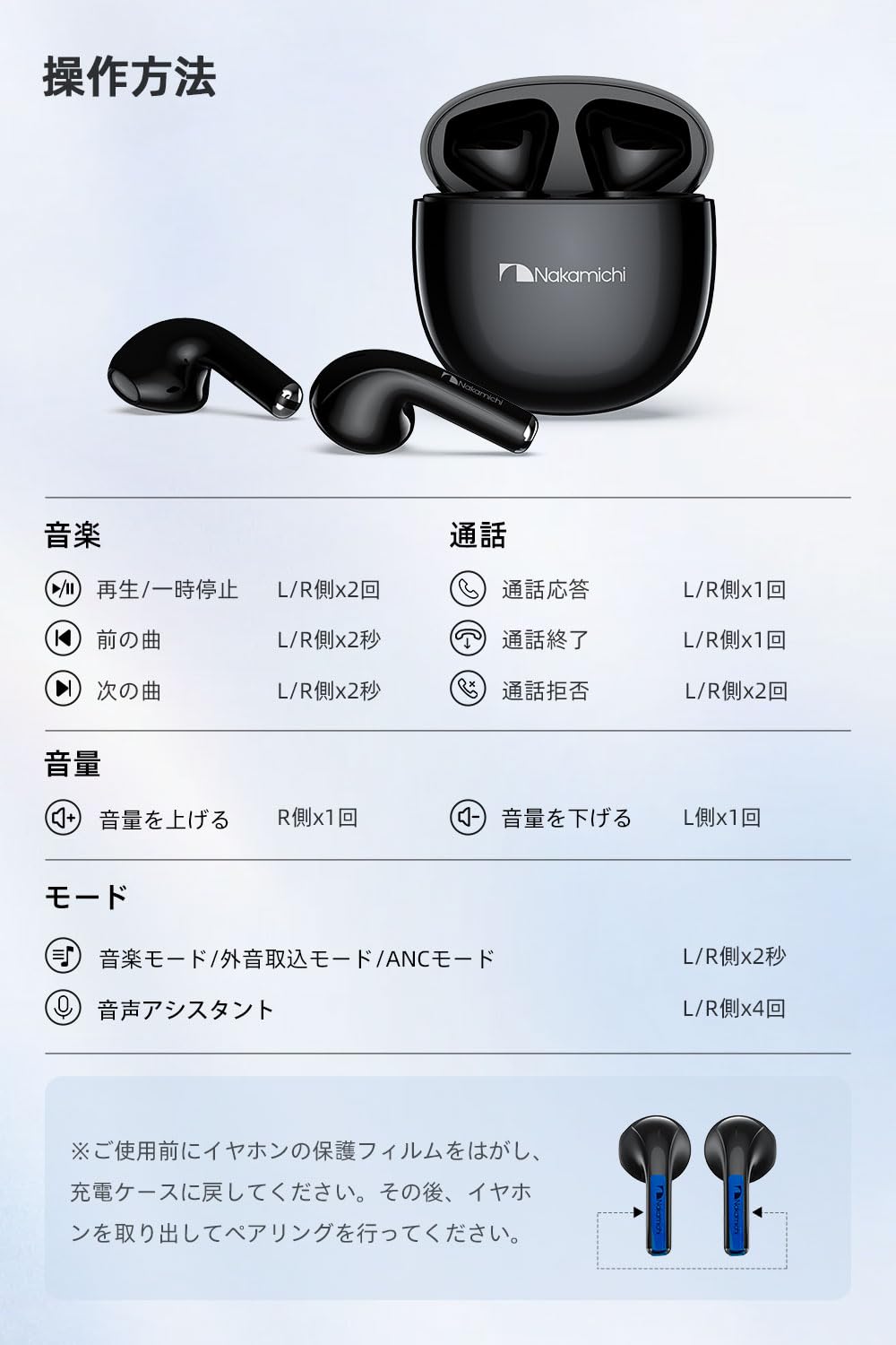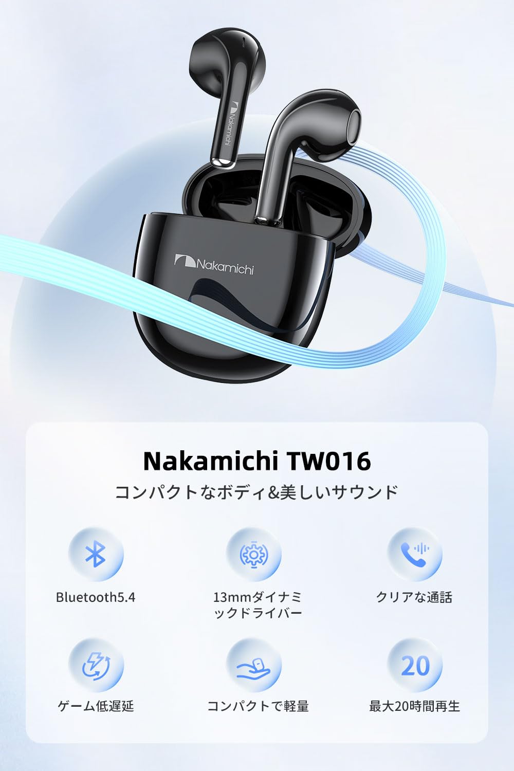 Nakamichi ワイヤレスイヤホン Bluetooth 5.4 13mmドライバー ハンズフリー通話 インナーイヤー型イヤフォン コンパクト 軽量 最大20時間音楽再生 ゲームモード 無線イヤホン TW016 ブラック