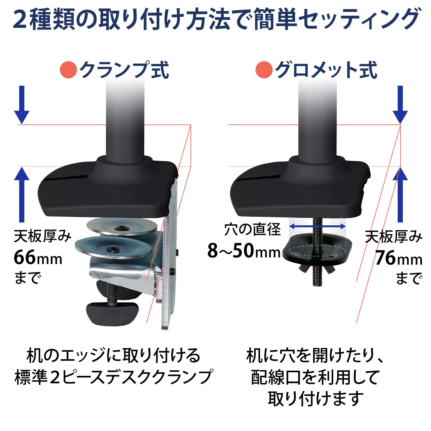 デスククランプは66mmの厚さに、グロメットマウントは直径8~50mmの穴、76mmまでの厚さに取り付け可能。
