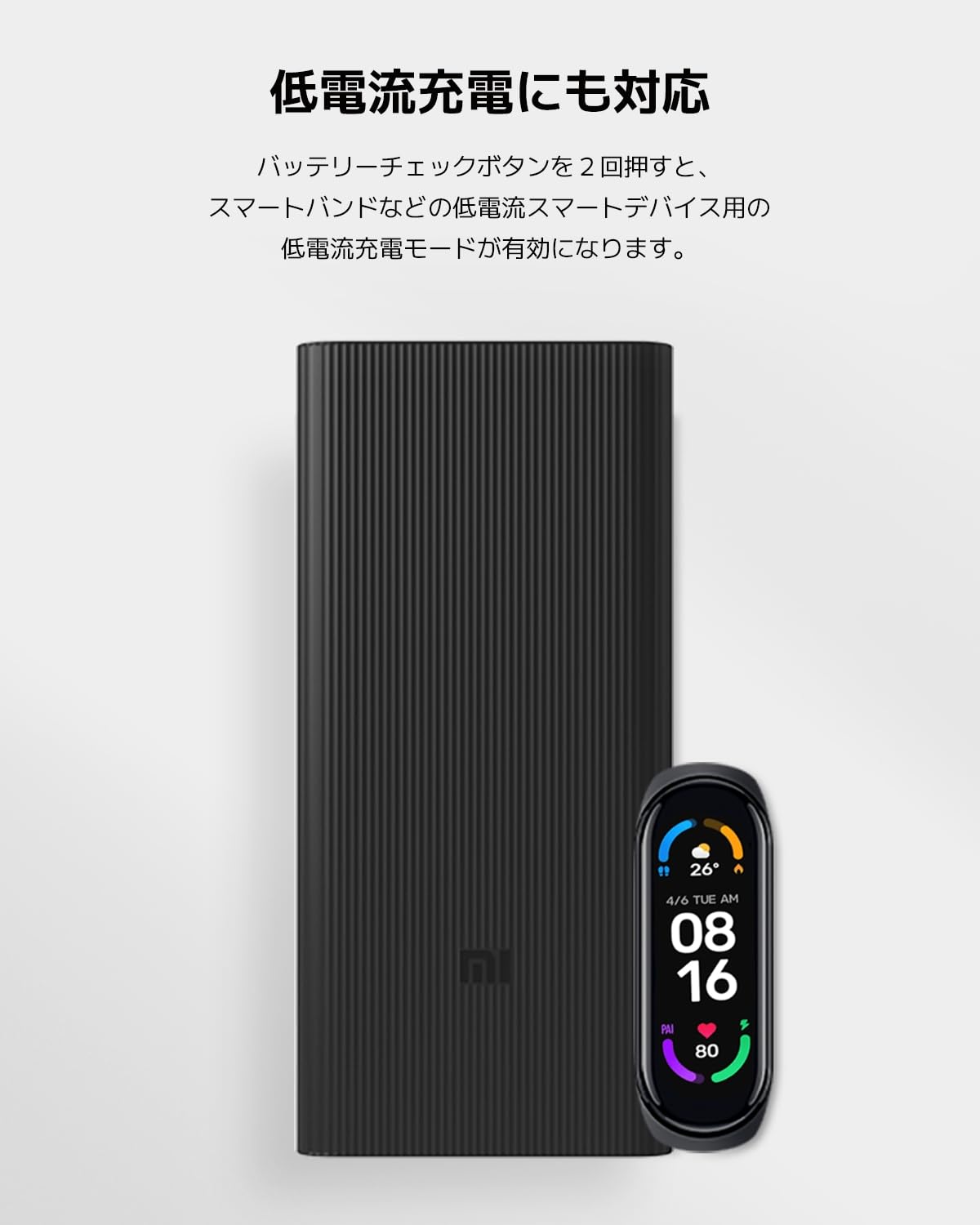 ■ 【低電流充電にも対応、USB機器との接続】バッテリーチェックボタンを2回押すと、スマートバンドなどの低電流スマートデバイス用の低電流充電モードが有効になります。