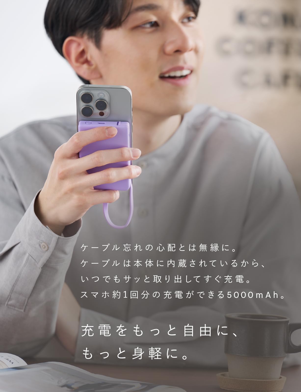 CIO Mate PowerBank002 モバイルバッテリー マグネット吸着 USB-C ケーブル内蔵 5000mAh (エアリーパープル) 15W 急速充電 小型 軽量 タイプC iPhone Android スマートフォン その他各機種対応 [ワイヤレス充電非対応]